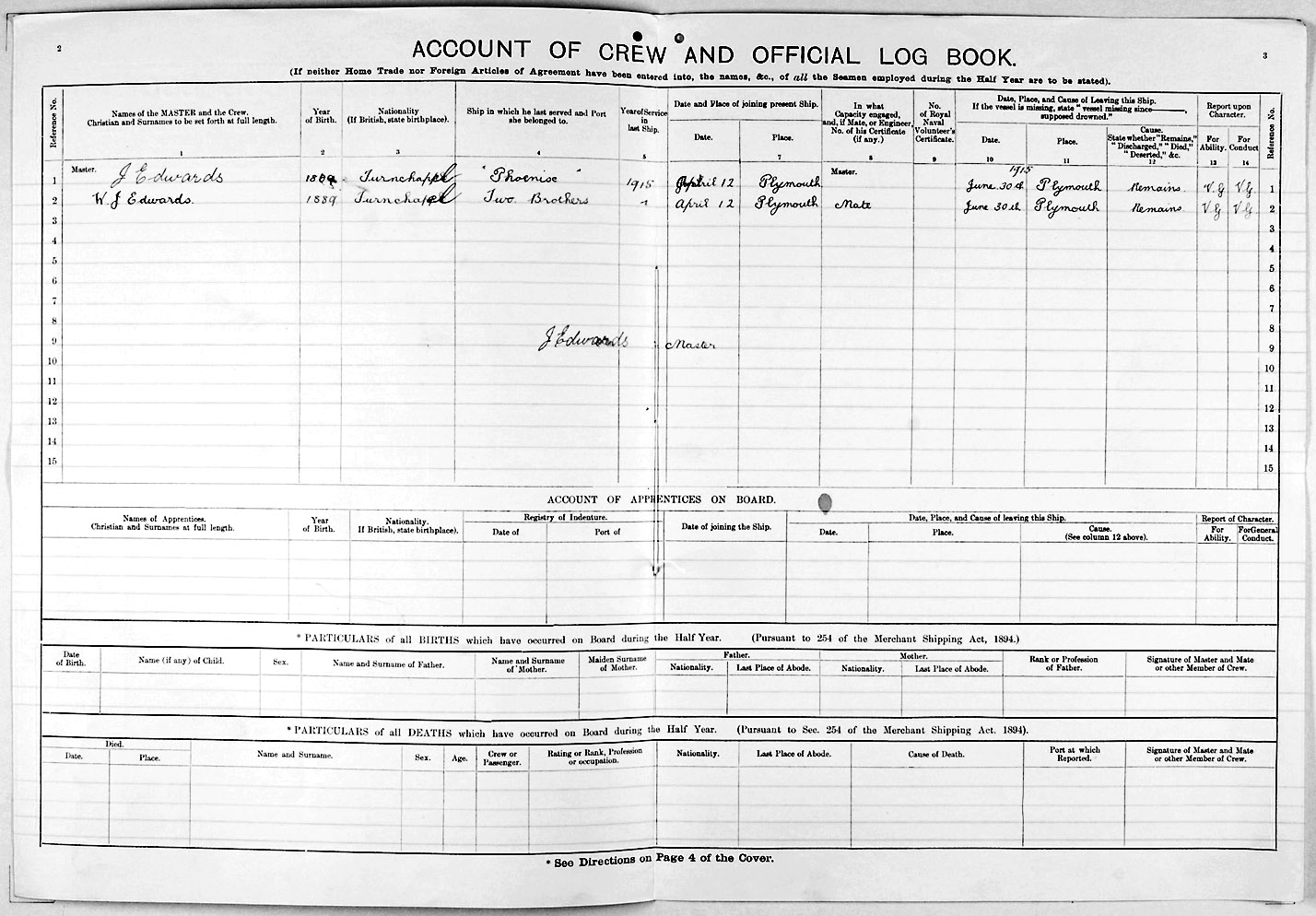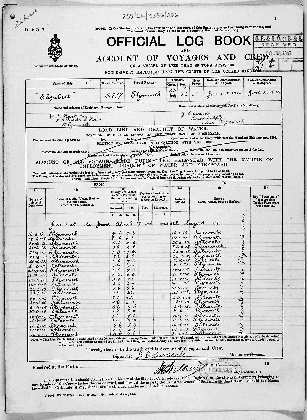 1915 crew list for the vessel 'ELIZABETH'