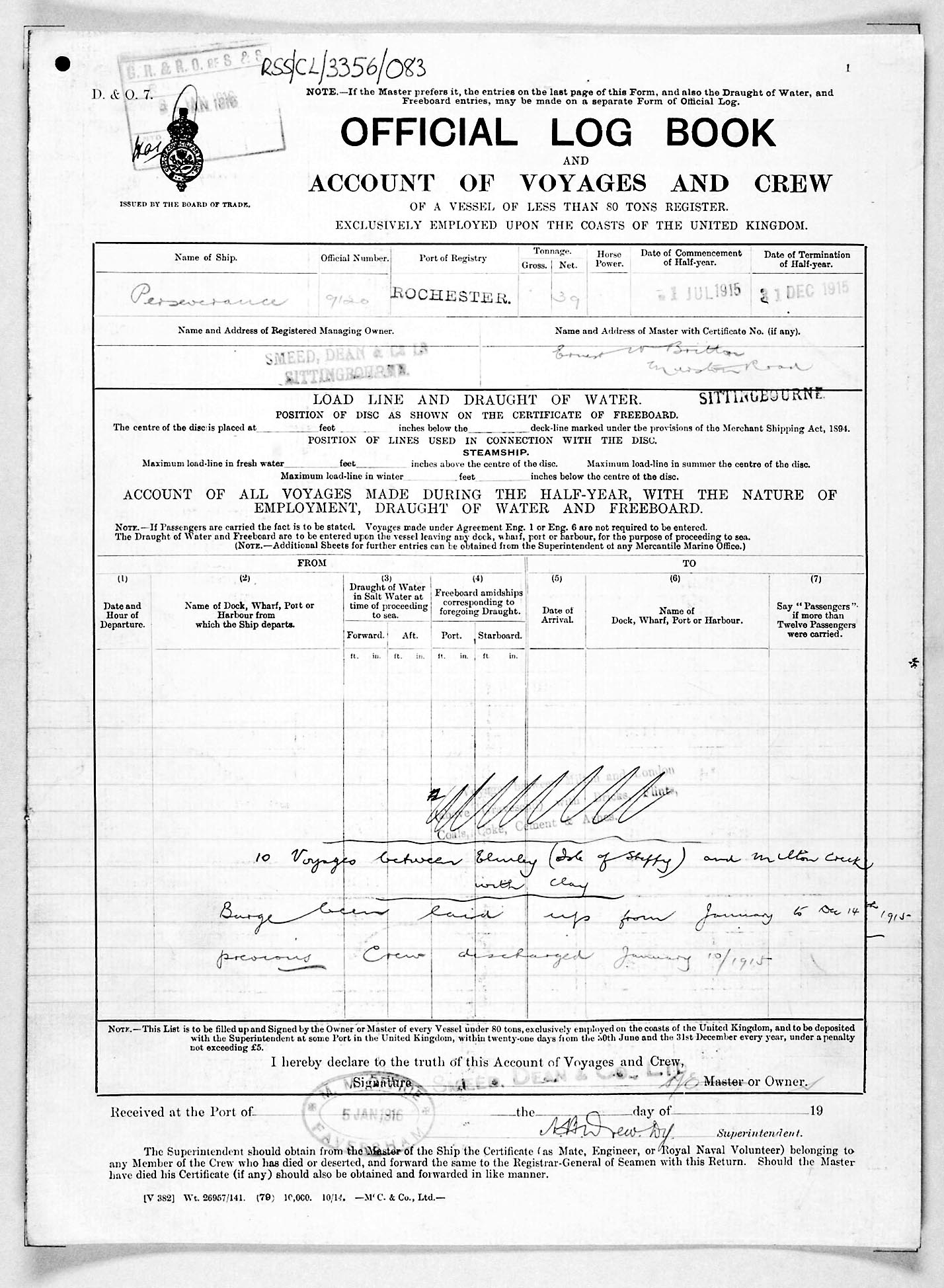 1915 crew list for the vessel 'PERSEVERANCE'