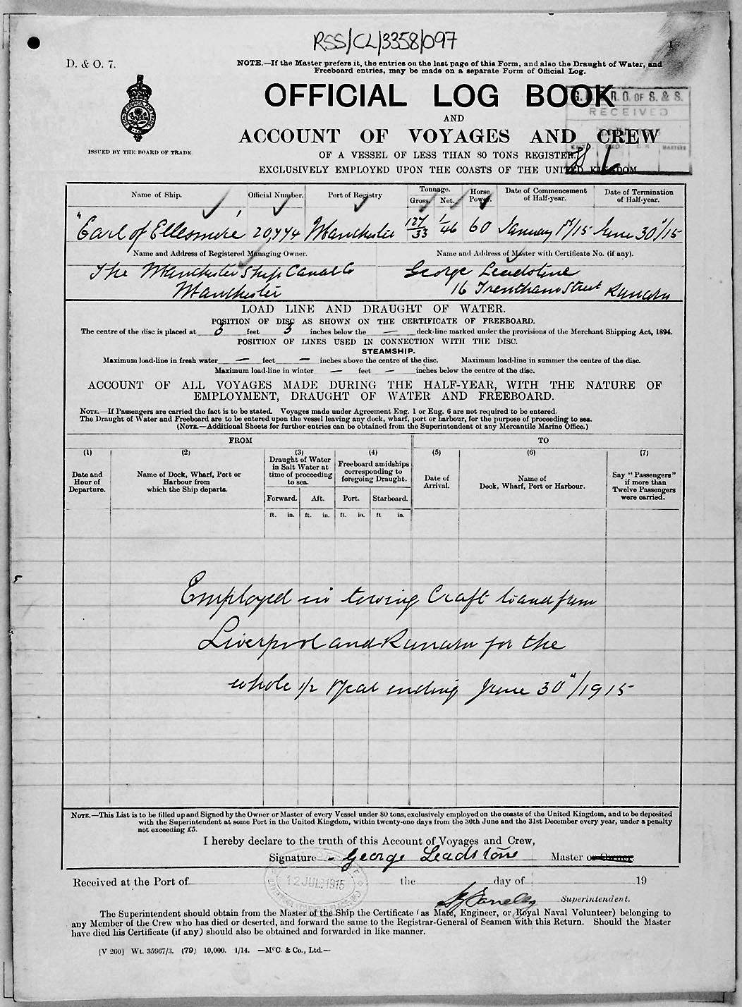 1915 crew list for the vessel 'EARL OF ELLESMERE'