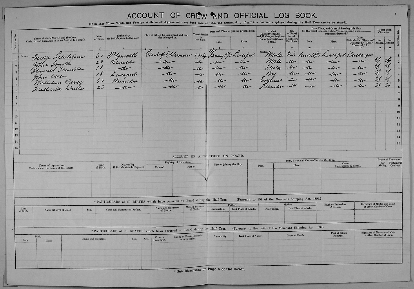 Crew list document for vessel 'EARL OF ELLESMERE'