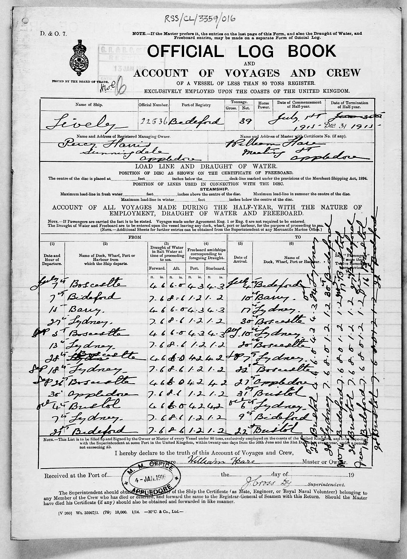 1915 crew list for the vessel 'LIVELY'