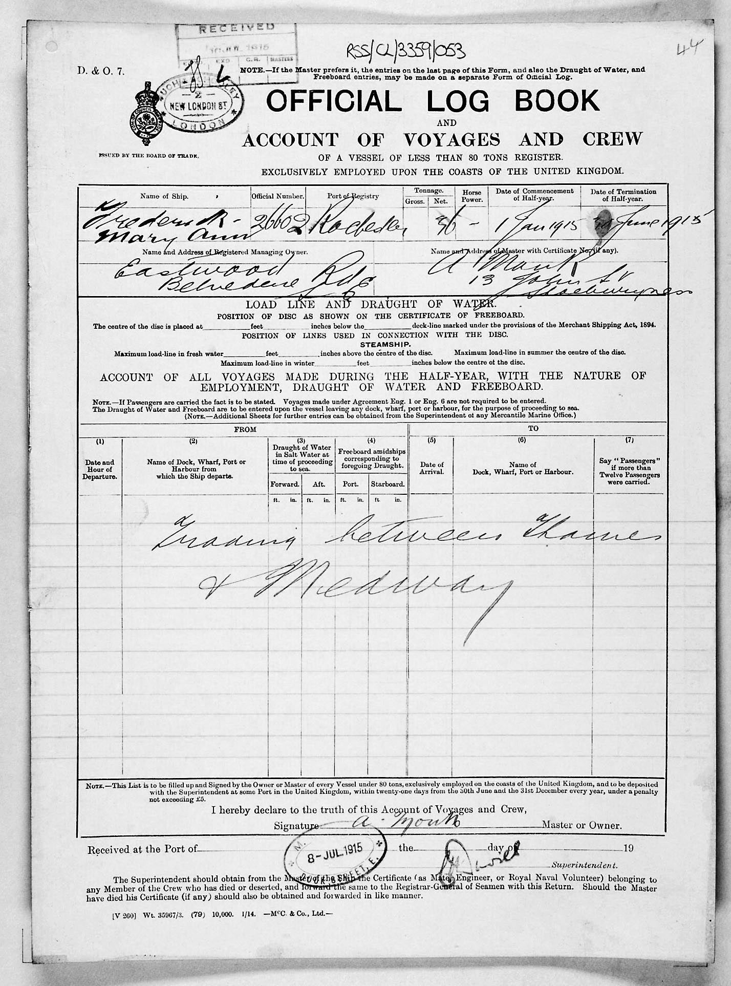 1915 crew list for the vessel 'FREDERICK & MARY ANN'