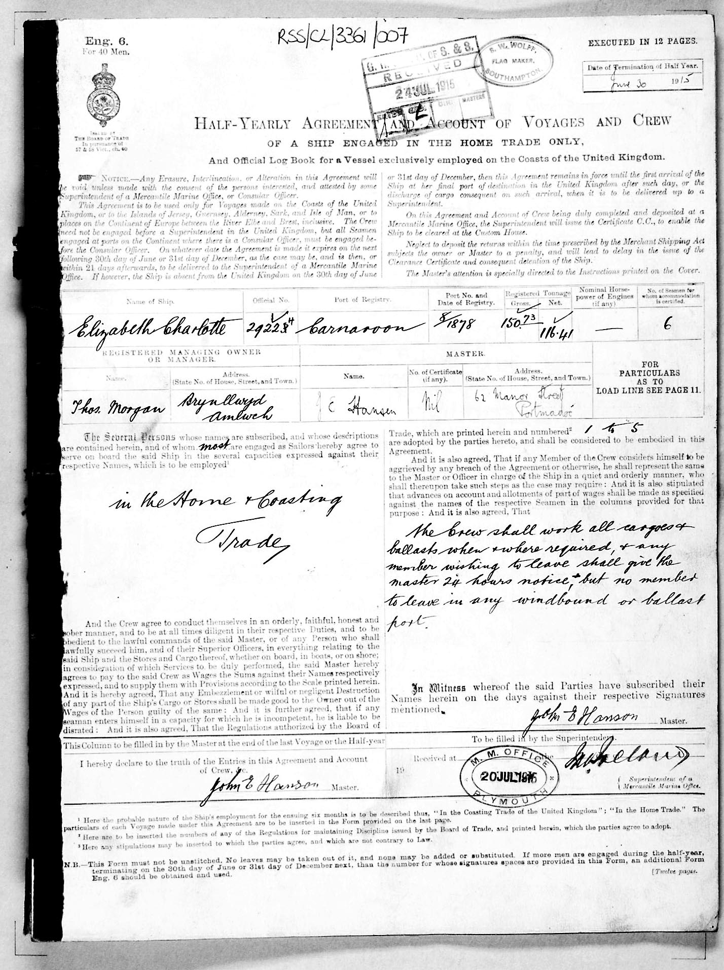 1915 crew list for the vessel 'ELIZABETH CHARLOTTE'