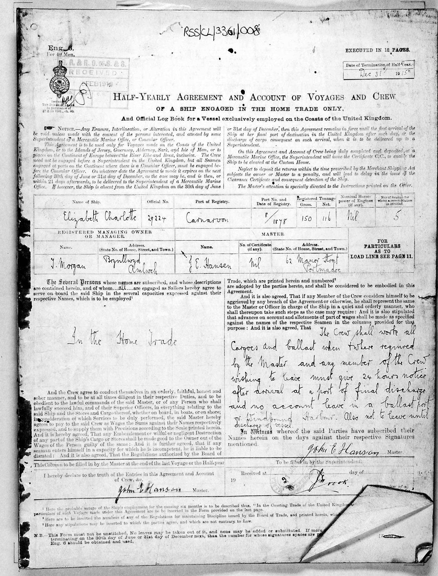 Crew list document for vessel 'ELIZABETH CHARLOTTE'