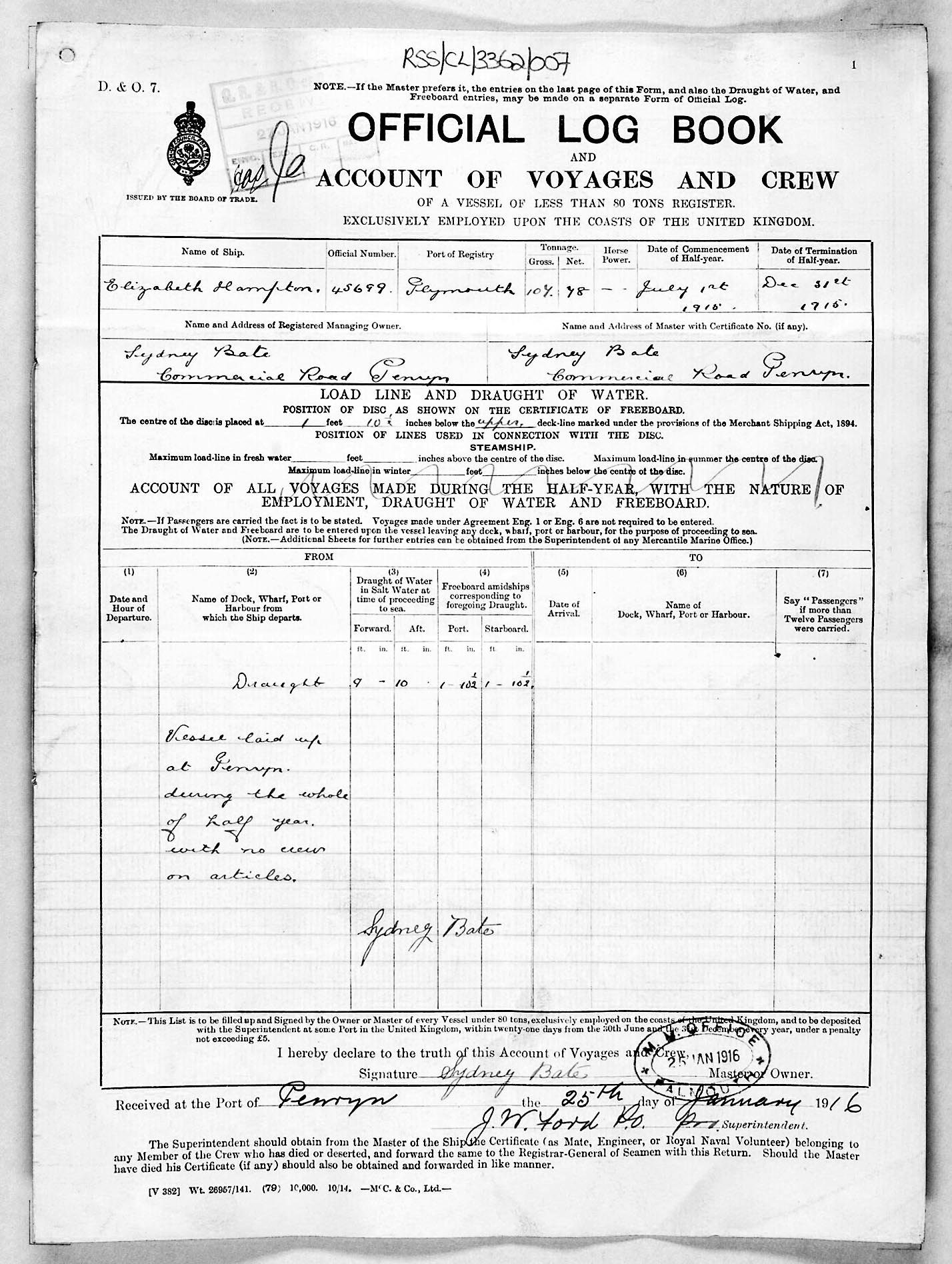 1915 crew list for the vessel 'ELIZABETH HAMPTON'
