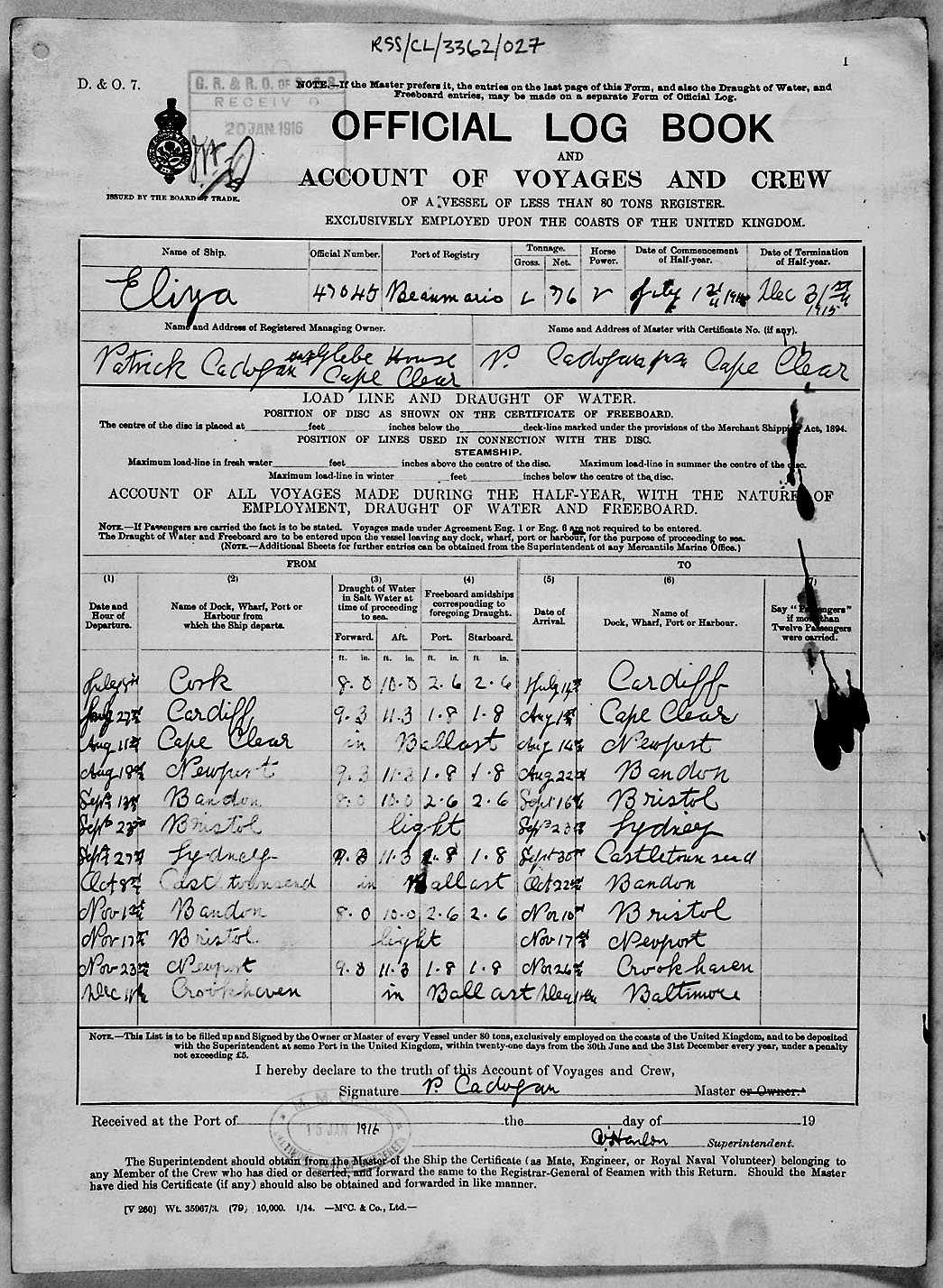 1915 crew list for the vessel 'ELIZA'