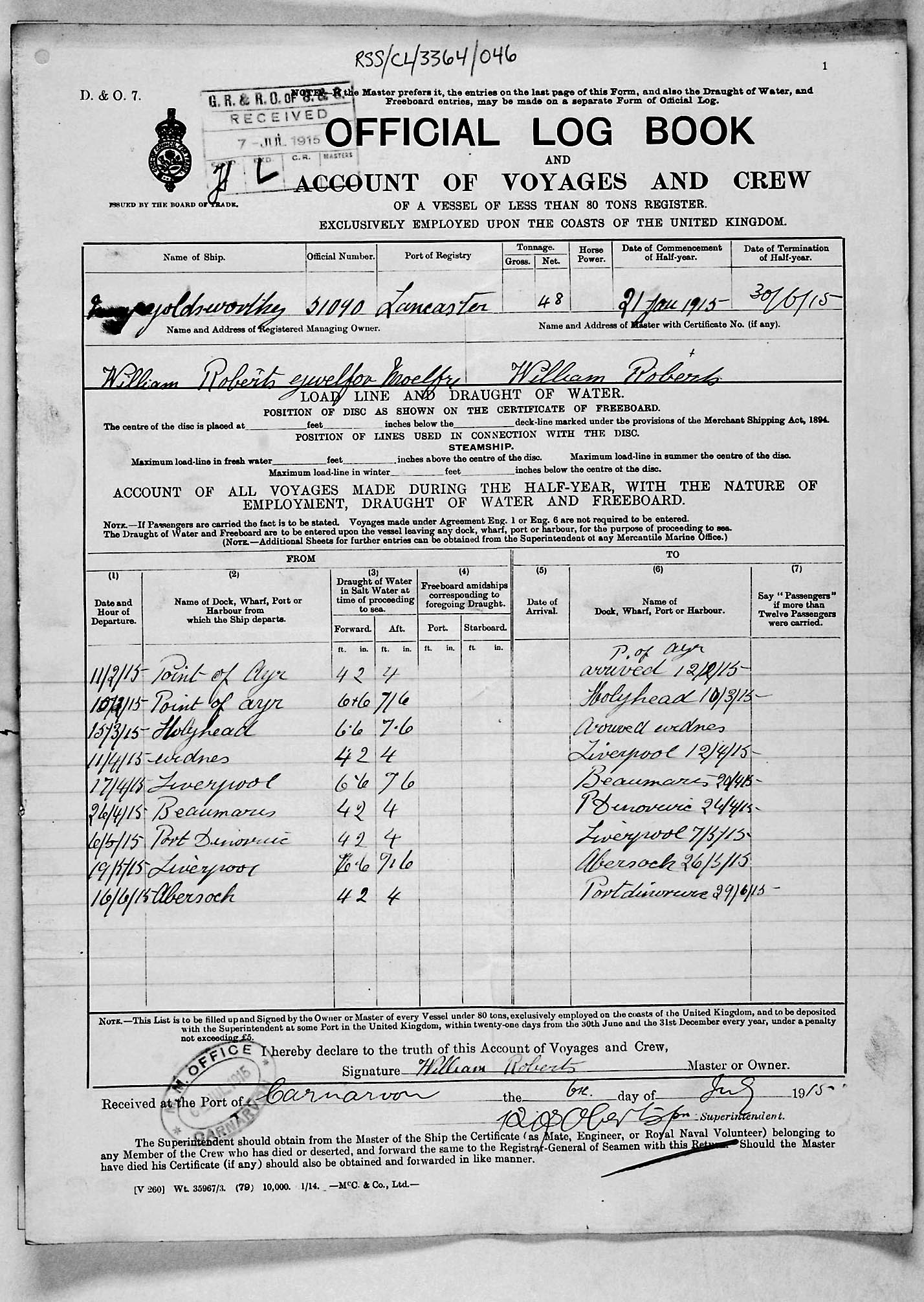 1915 crew list for the vessel 'MARY GOLDSWORTHY'