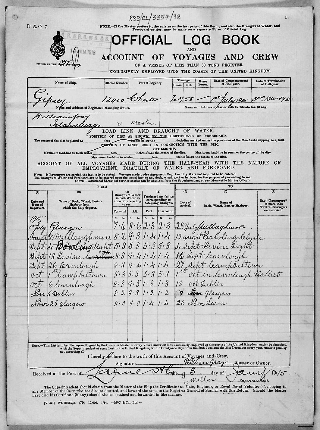 1915 crew list for the vessel 'GIPSEY'