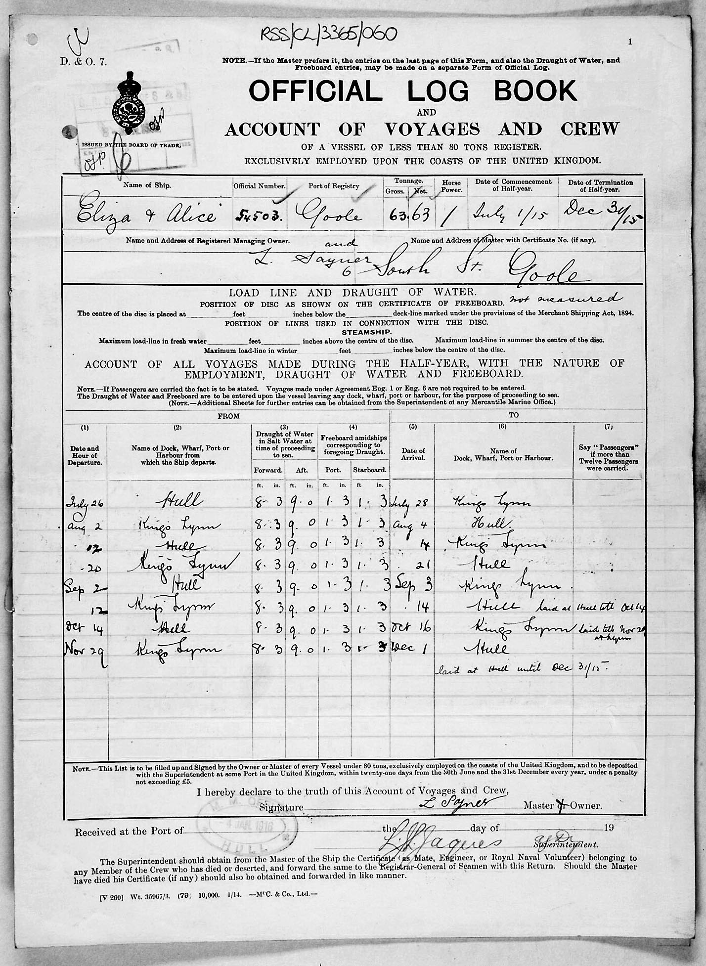 1915 crew list for the vessel 'ELIZA & ALICE'