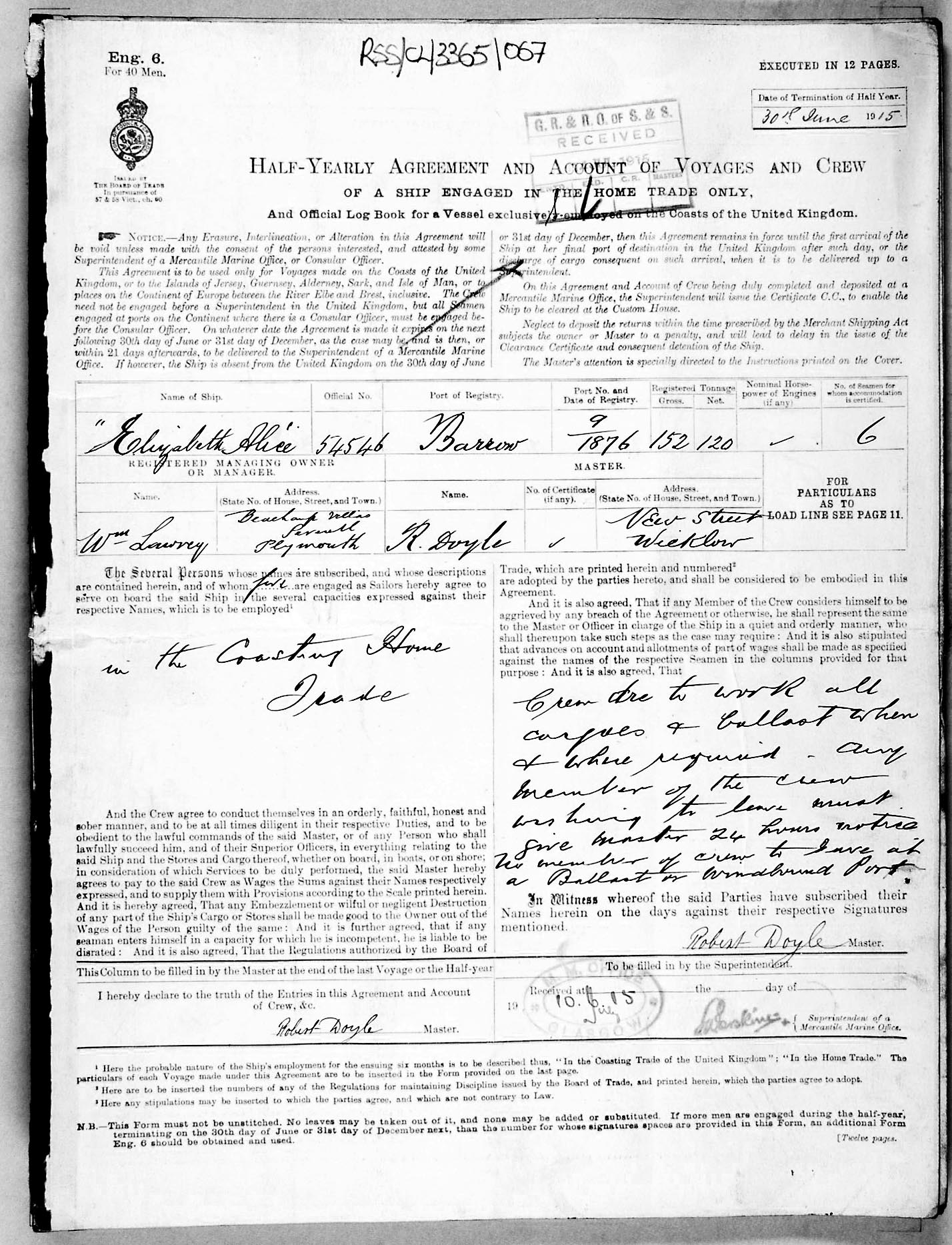 1915 crew list for the vessel 'ELIZABETH ALICE'