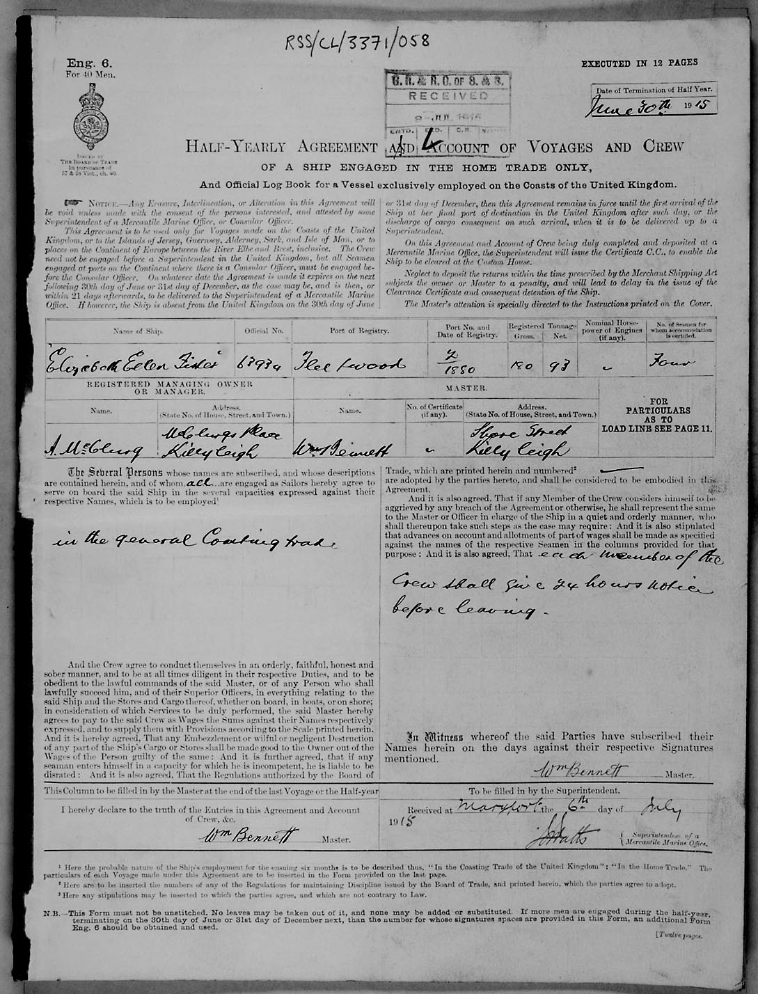 Crew list document for vessel 'ELIZABETH ELLEN FISHER'