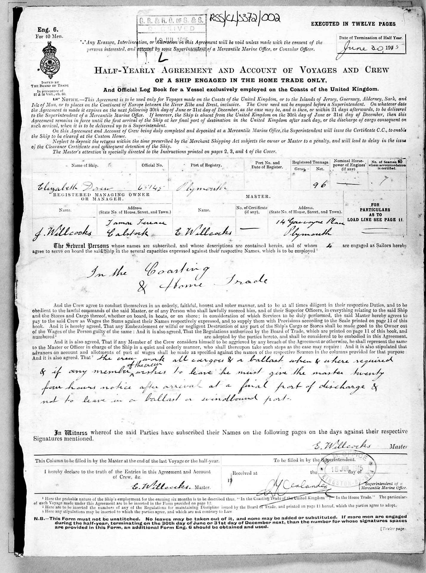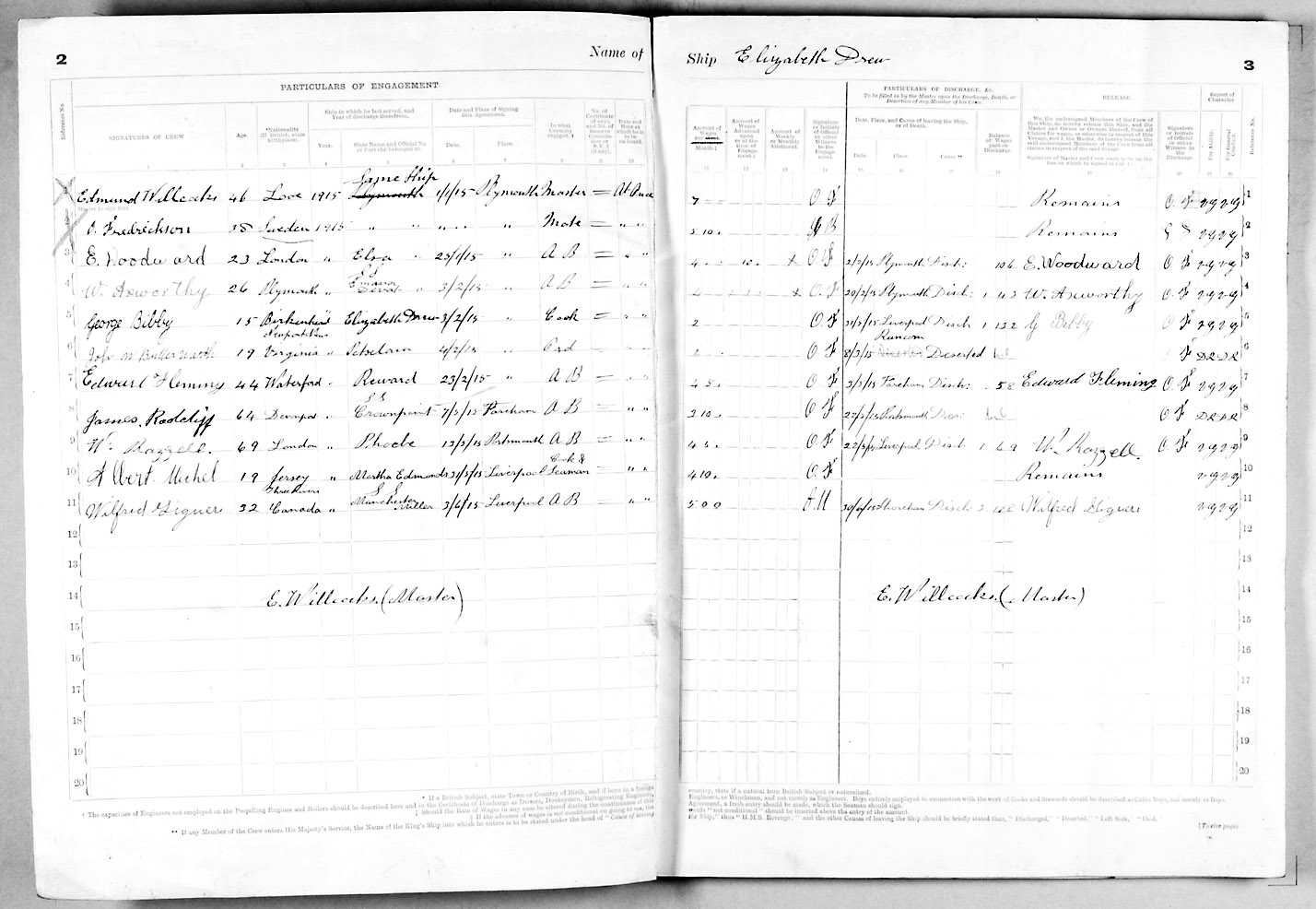 1915 crew list for the vessel 'ELIZABETH DREW'