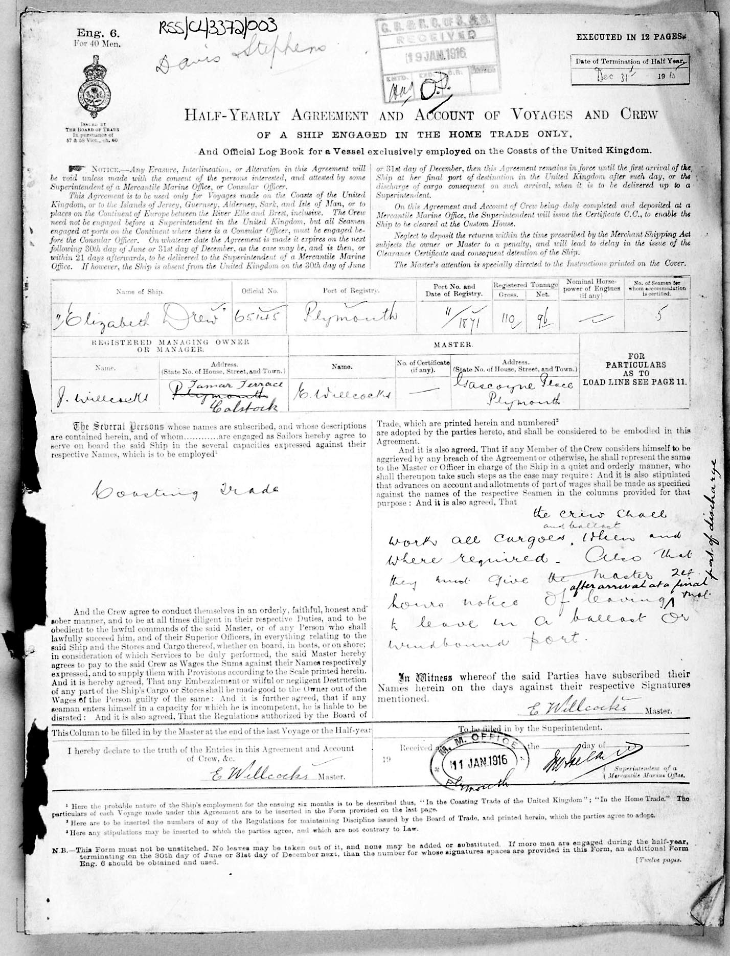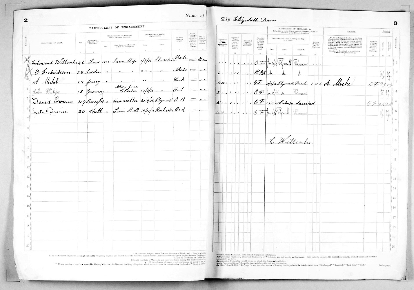 1915 crew list for the vessel 'ELIZABETH DREW'