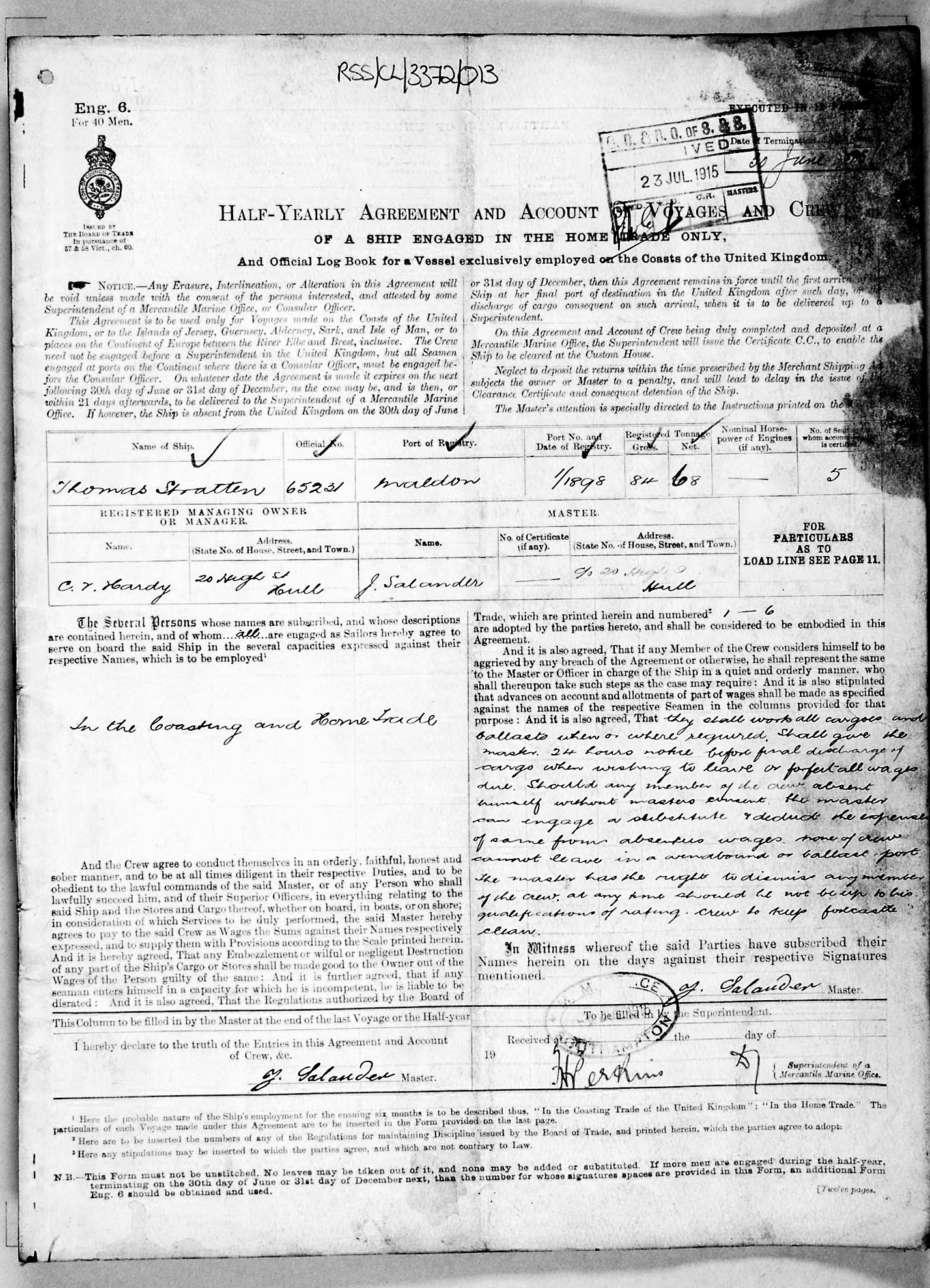 1915 crew list for the vessel 'THOMAS STRATTEN'