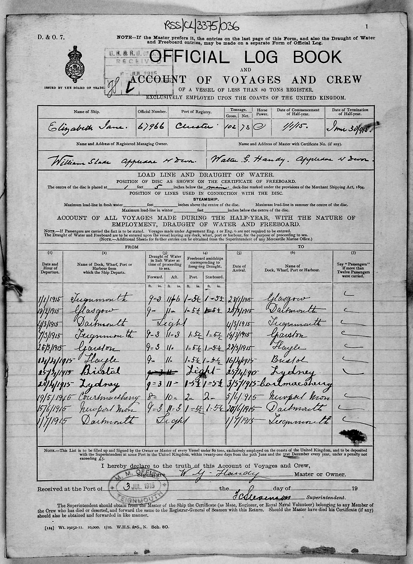 1915 crew list for the vessel 'ELIZABETH JANE'