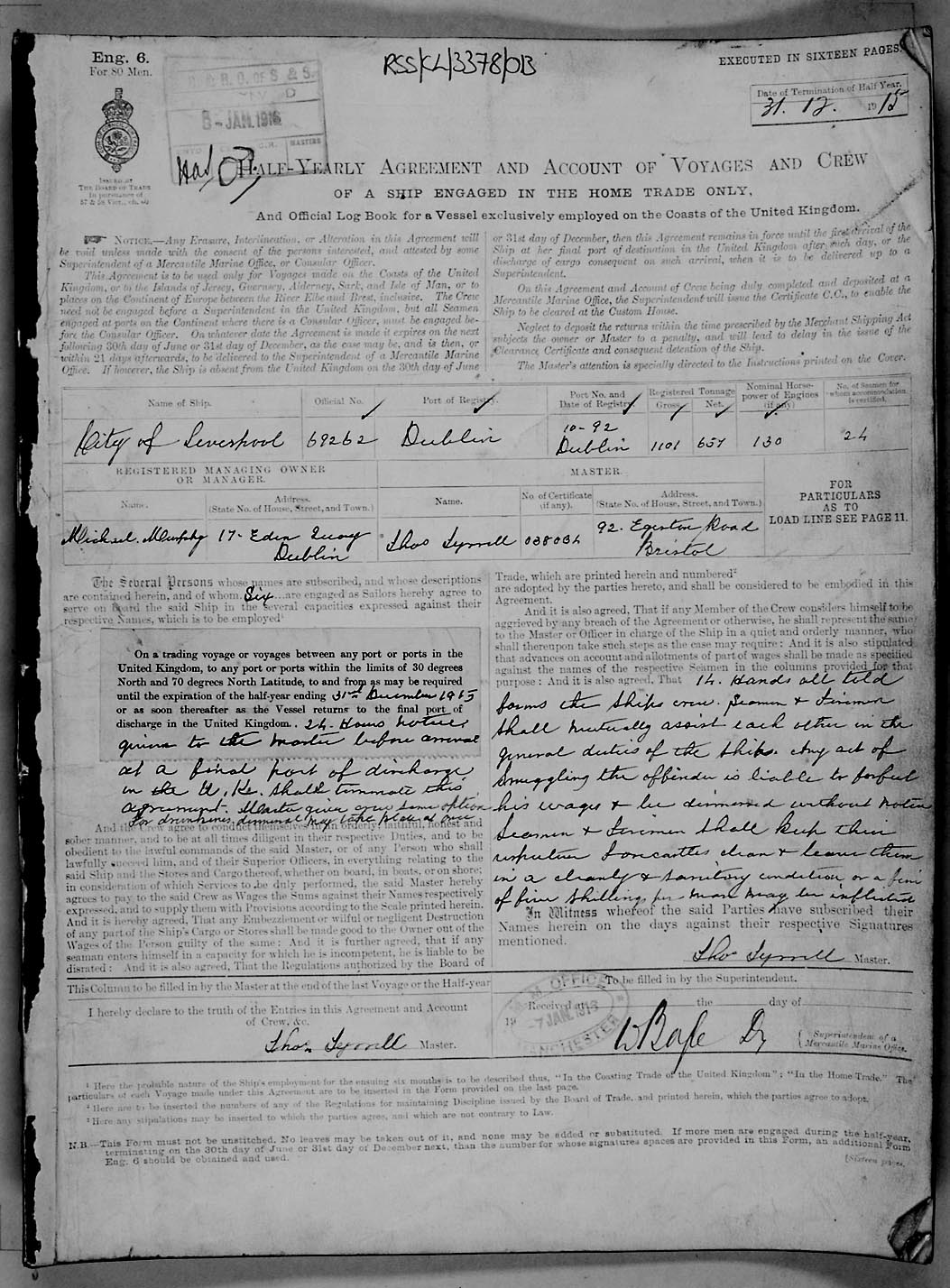 1915 crew list for the vessel 'CITY OF LIVERPOOL'