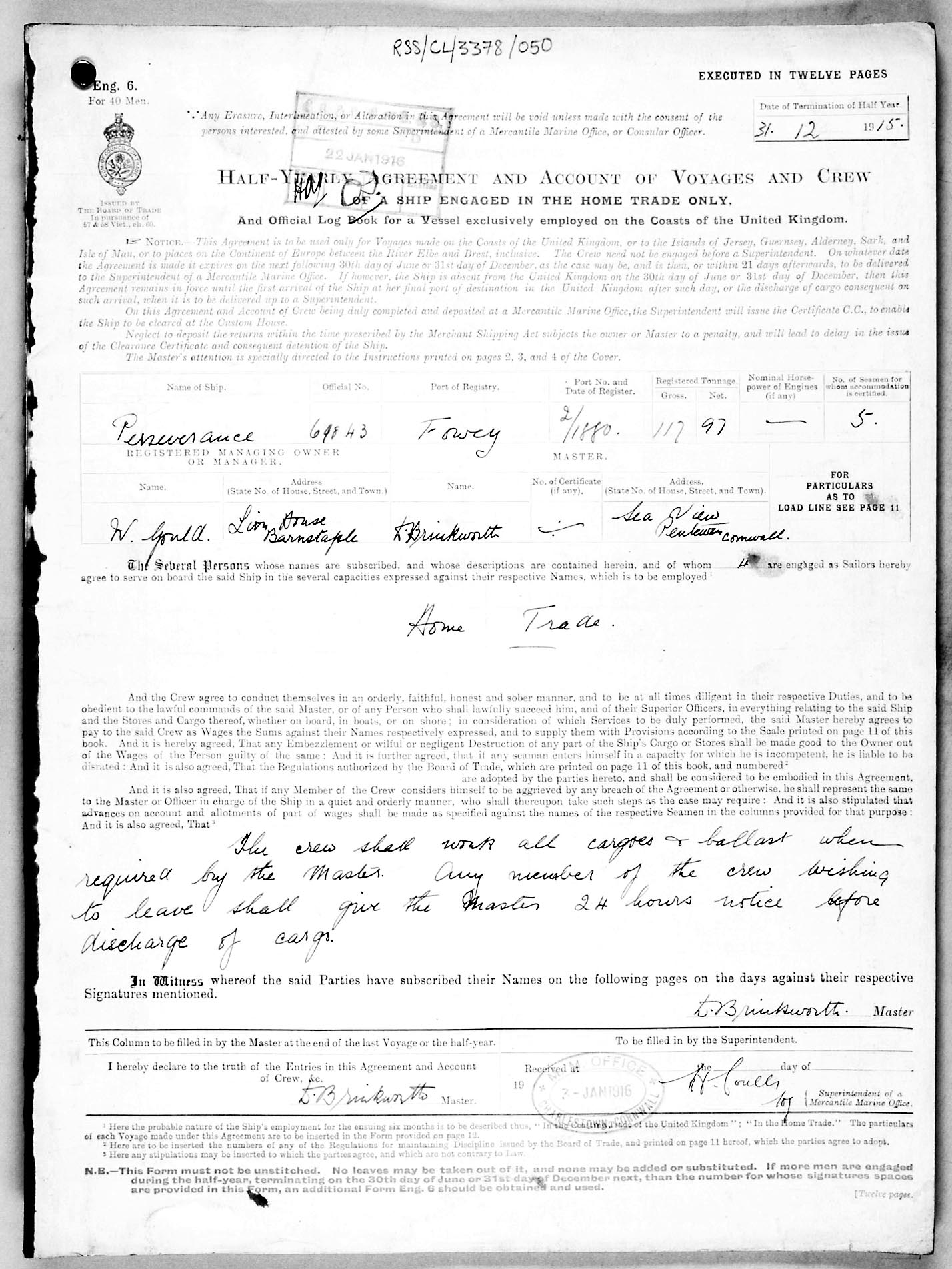 1915 crew list for the vessel 'PERSEVERANCE'