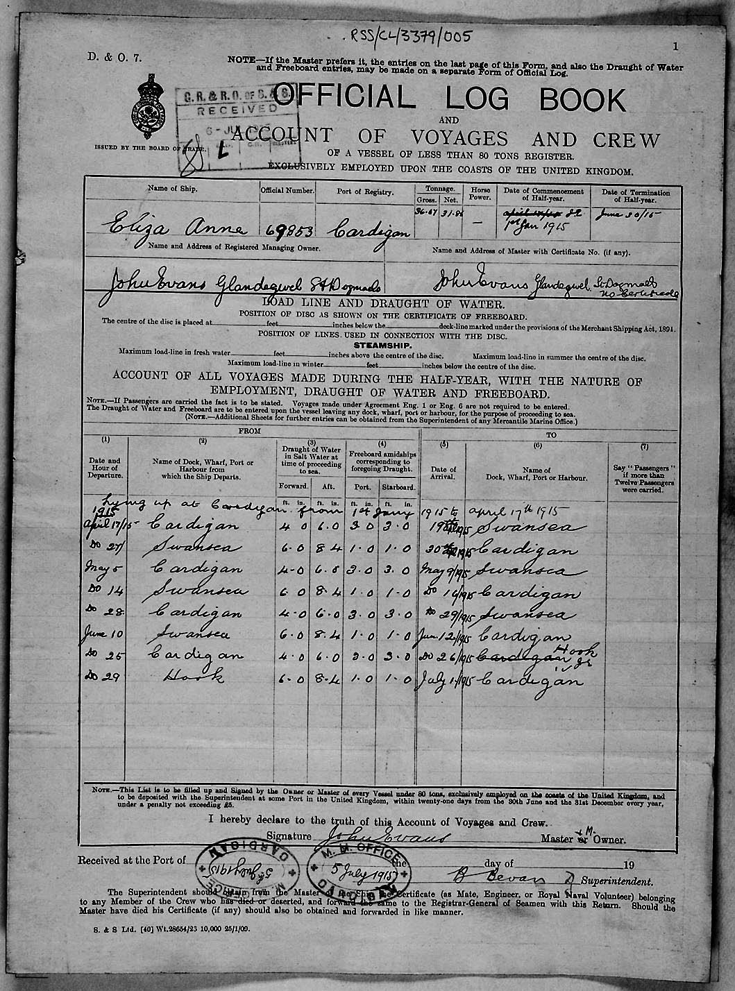 1915 crew list for the vessel 'ELIZA ANNE'