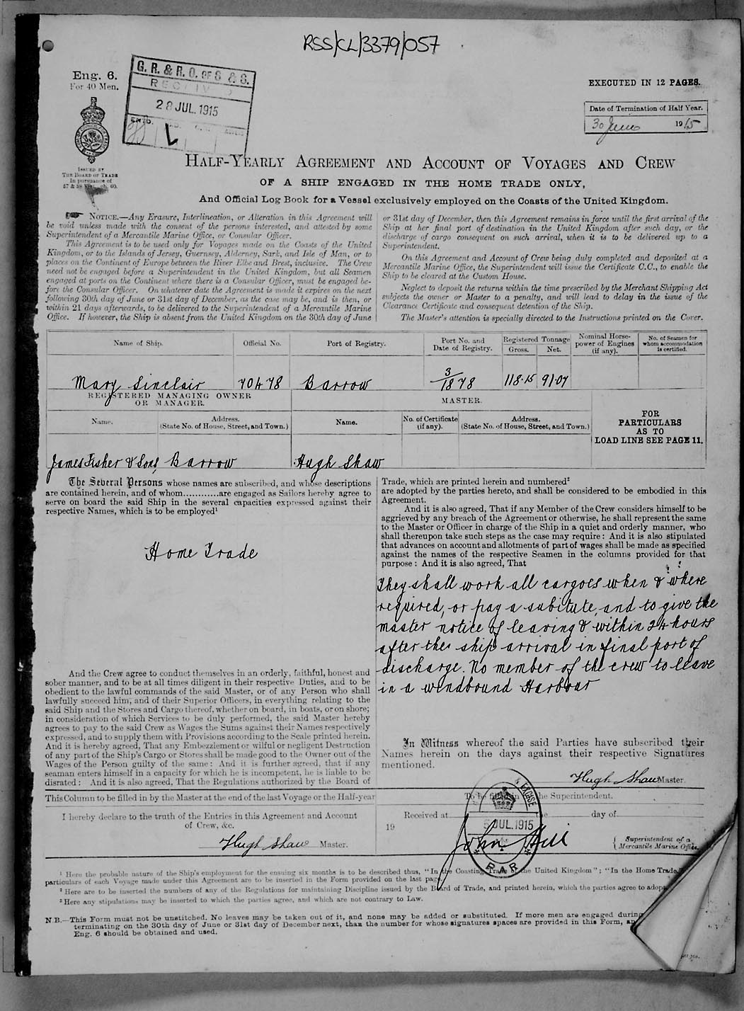 1915 crew list for the vessel 'MARY SINCLAIR'