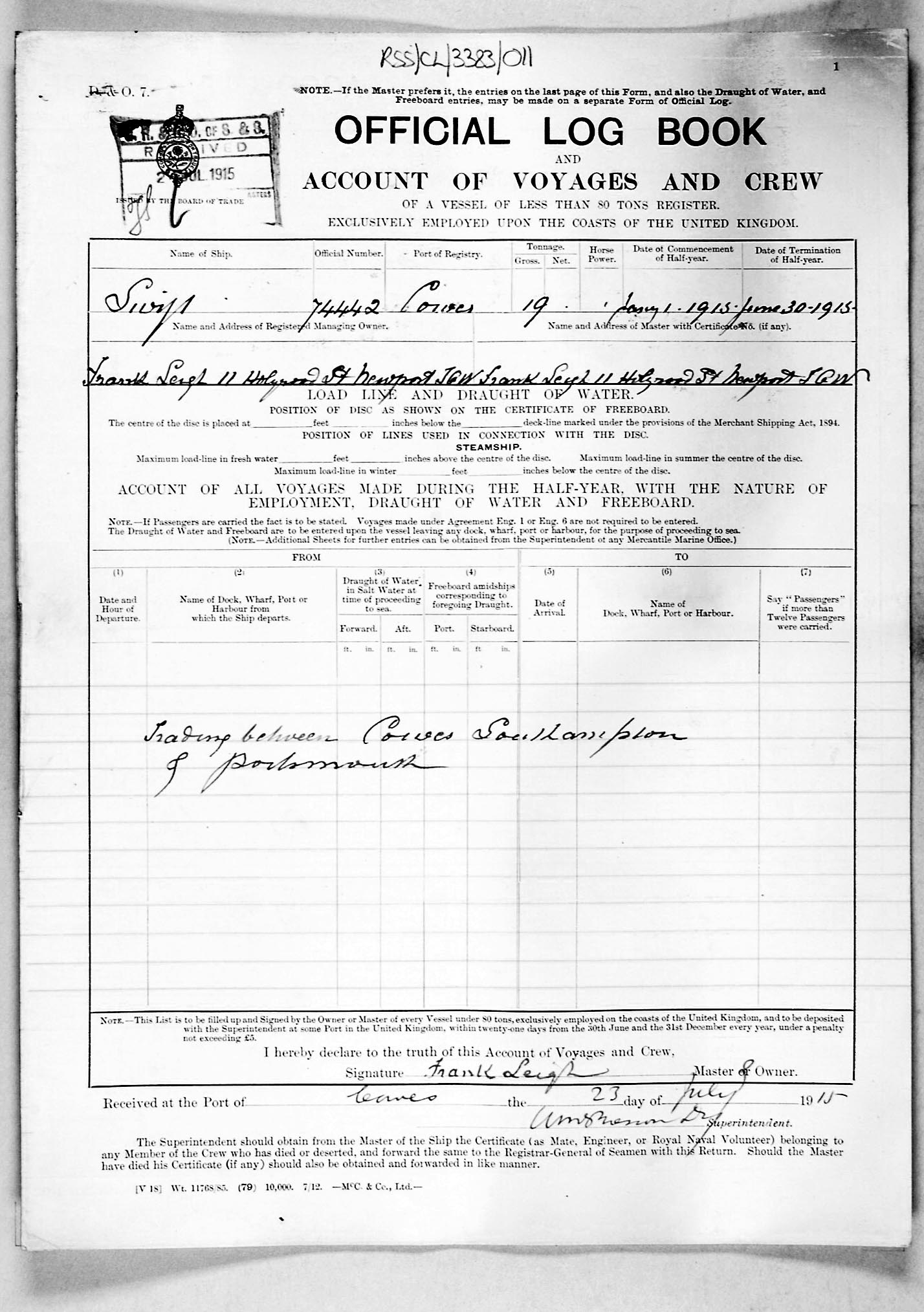1915 crew list for the vessel 'SWIFT'