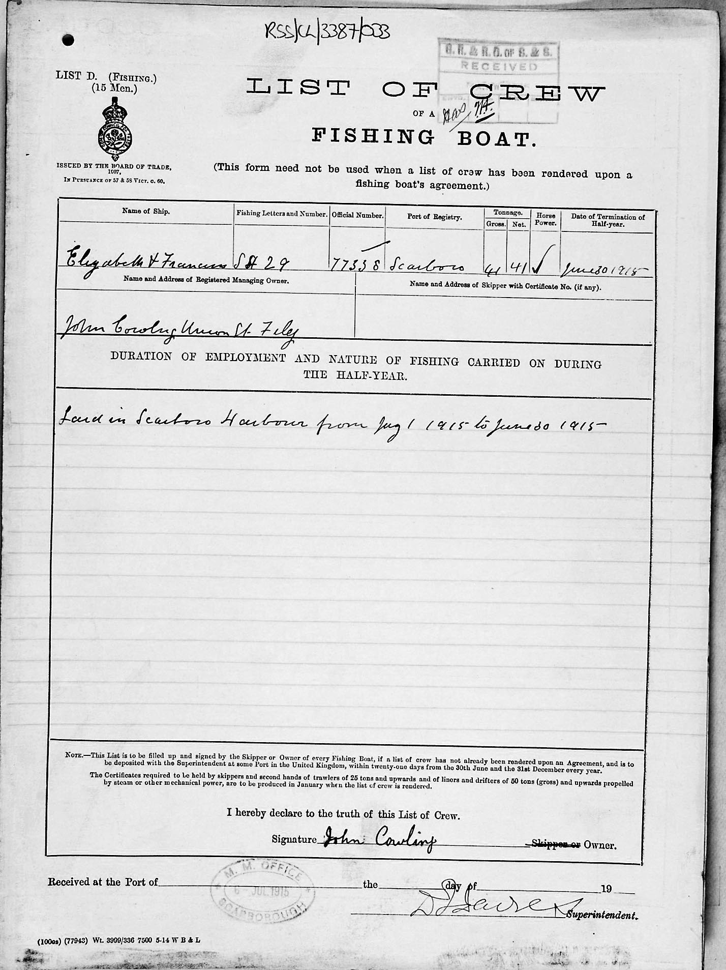Crew list document for vessel 'ELIZABETH & FRANCES'