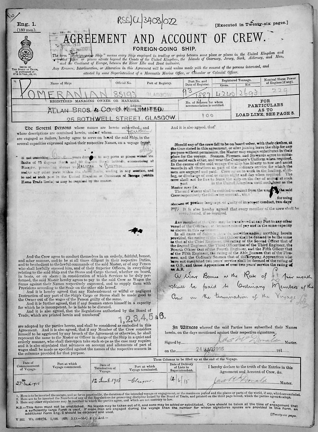 1915 crew list for the vessel 'POMERANIAN'