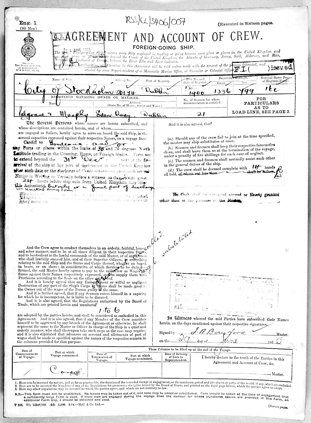 1915 crew list for the vessel 'CITY OF STOCKHOLM'
