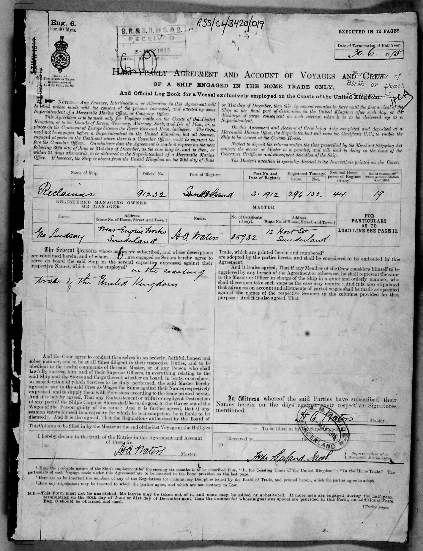 1915 crew list for the vessel 'RECLAIMER'