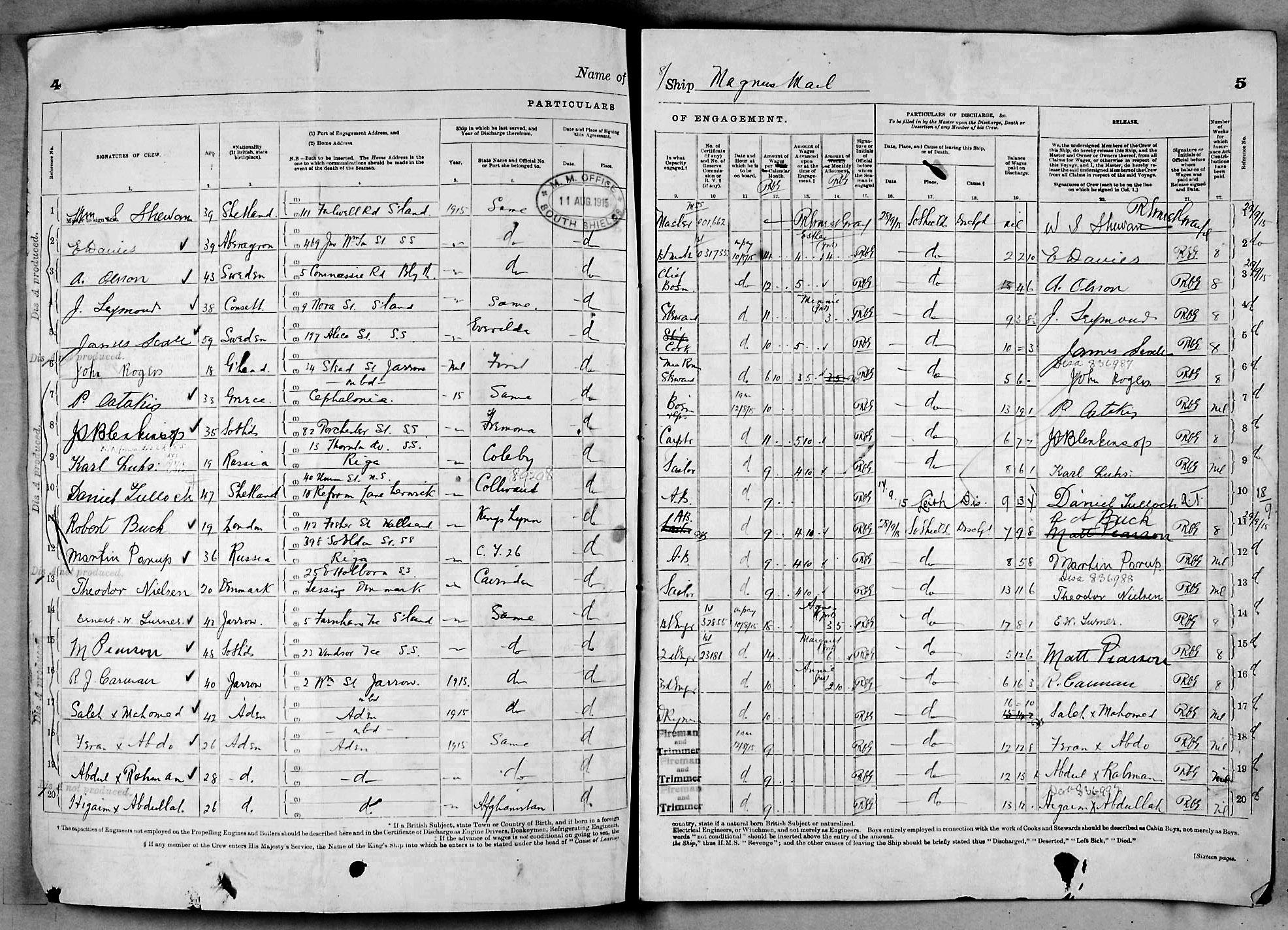 1915 crew list for the vessel 'MAGNUS MAIL'