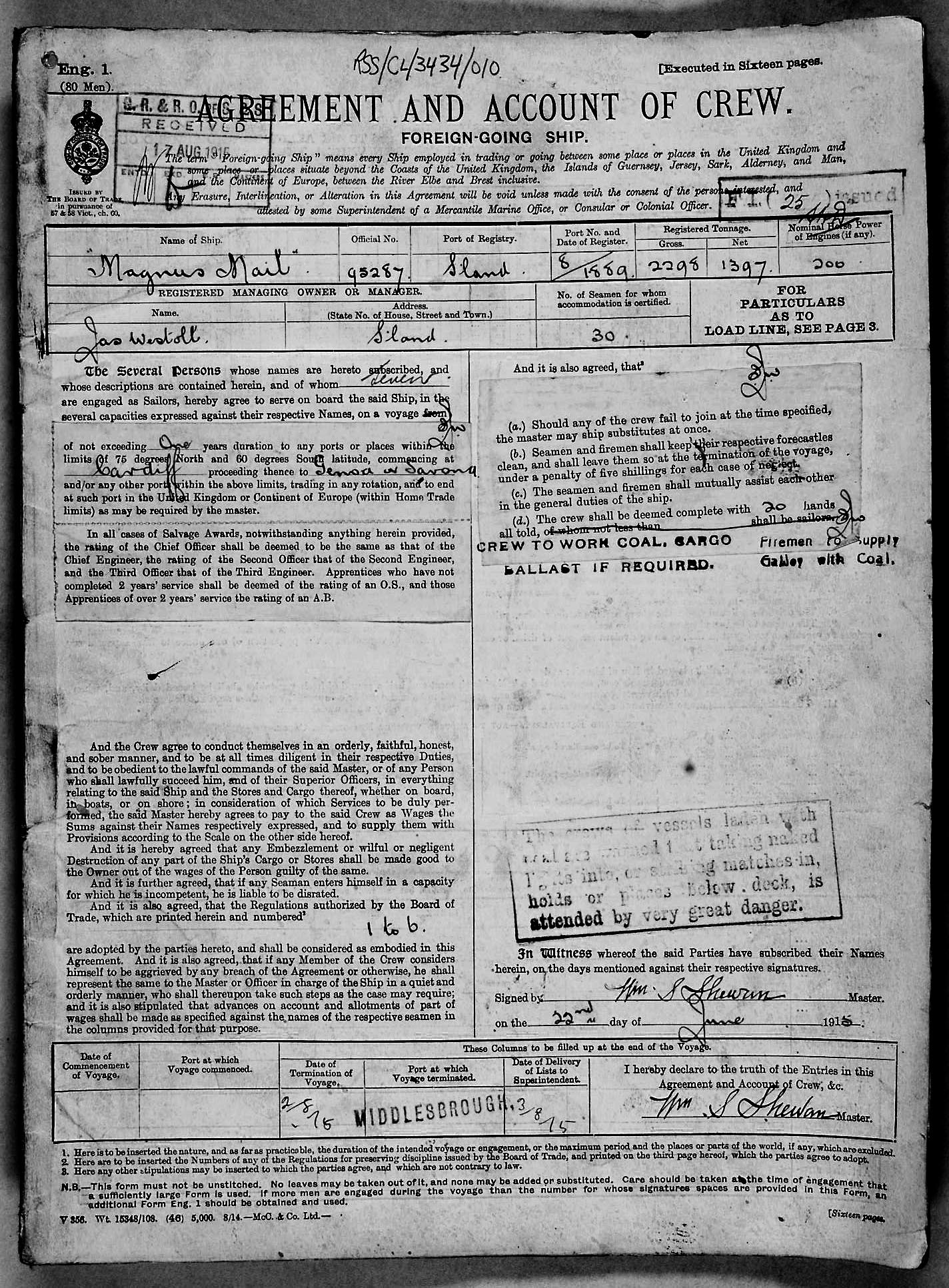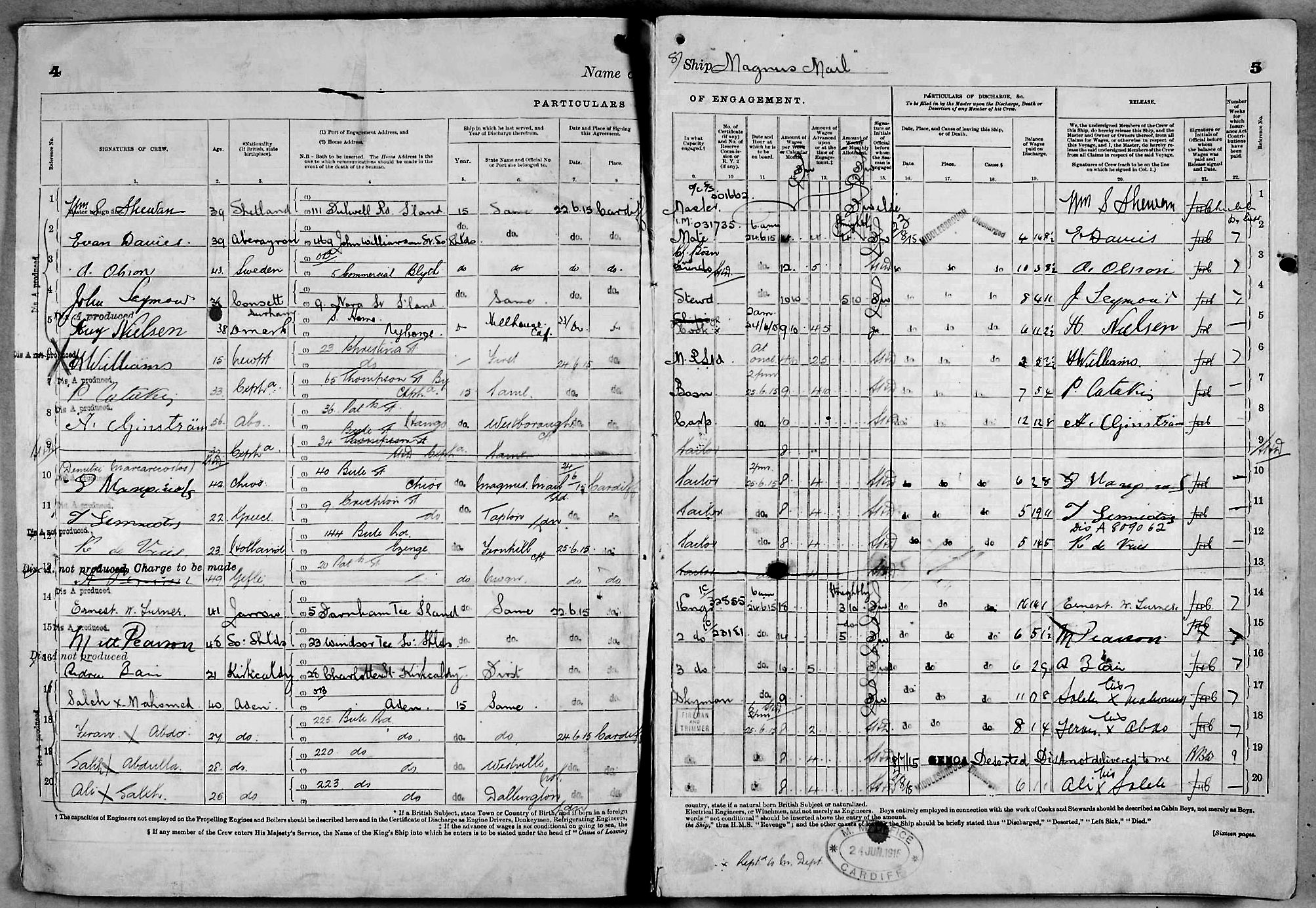 1915 crew list for the vessel 'MAGNUS MAIL'