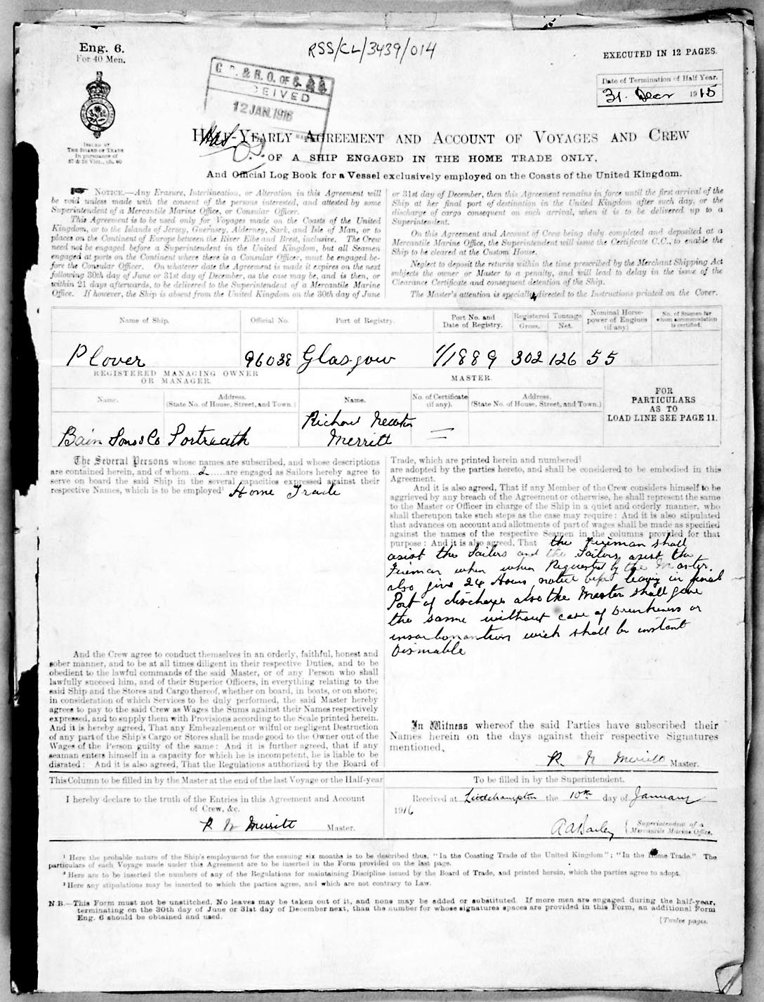 Crew list document for vessel 'PLOVER'