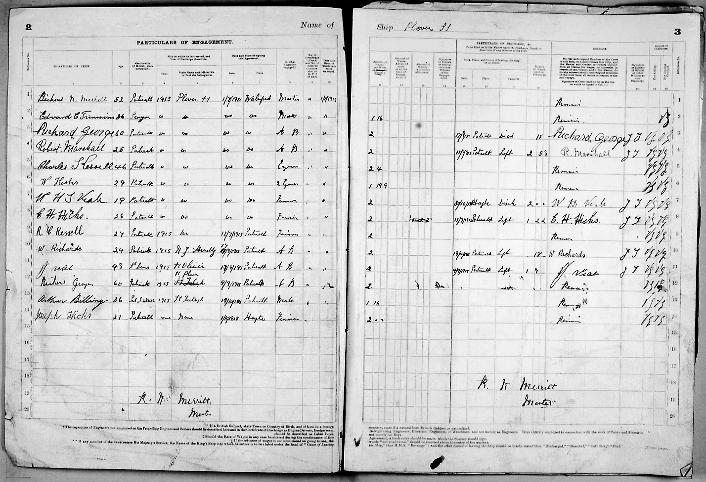 1915 crew list for the vessel 'PLOVER'