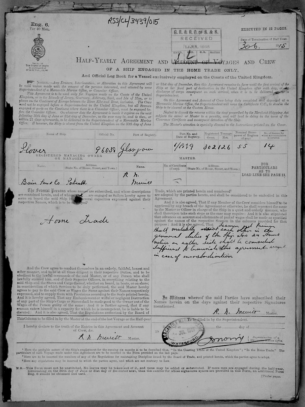 Crew list document for vessel 'PLOVER'