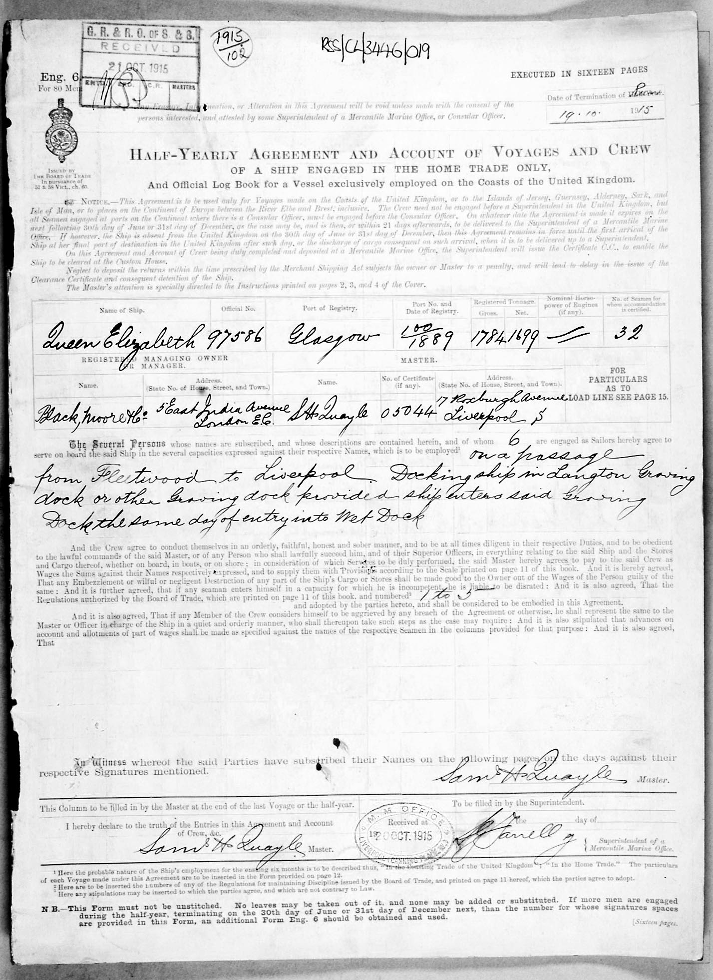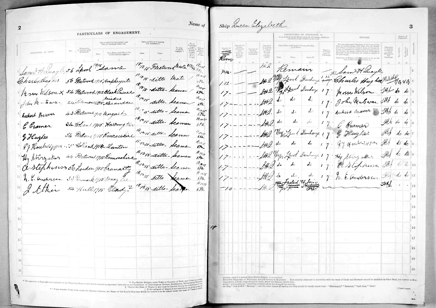 1915 crew list for the vessel 'QUEEN ELIZABETH'