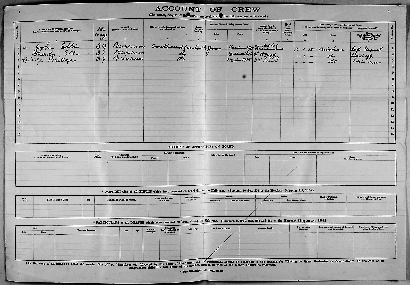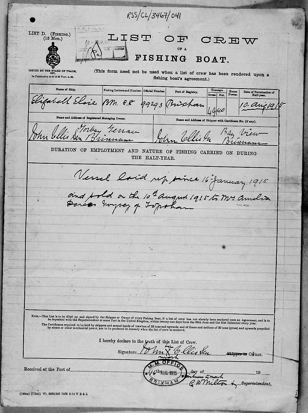 1915 crew list for the vessel 'ELIZABETH ELSIE'