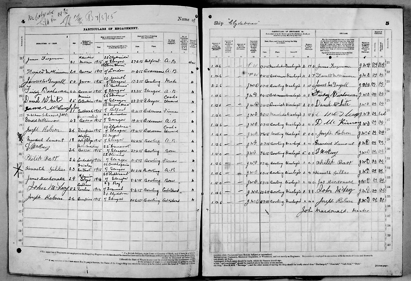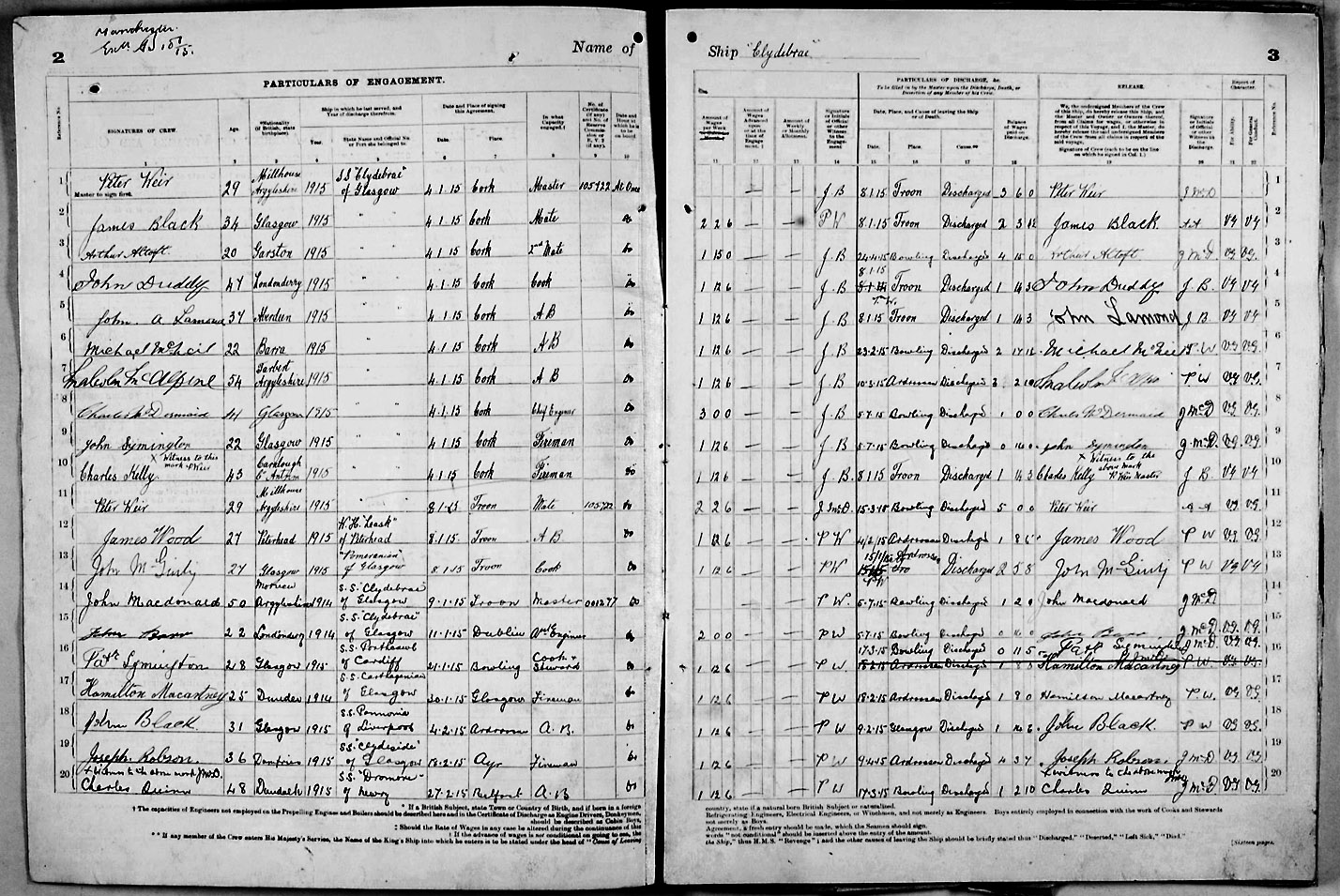 1915 crew list for the vessel 'CLYDEBRAE'