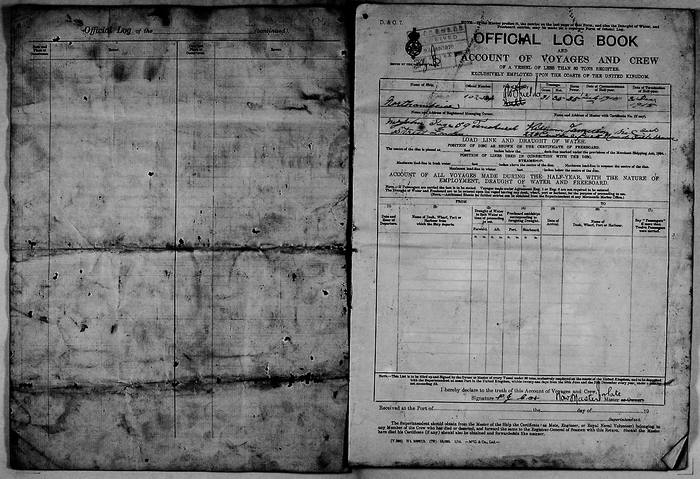 1915 crew list for the vessel 'NORTHUMBRIA'