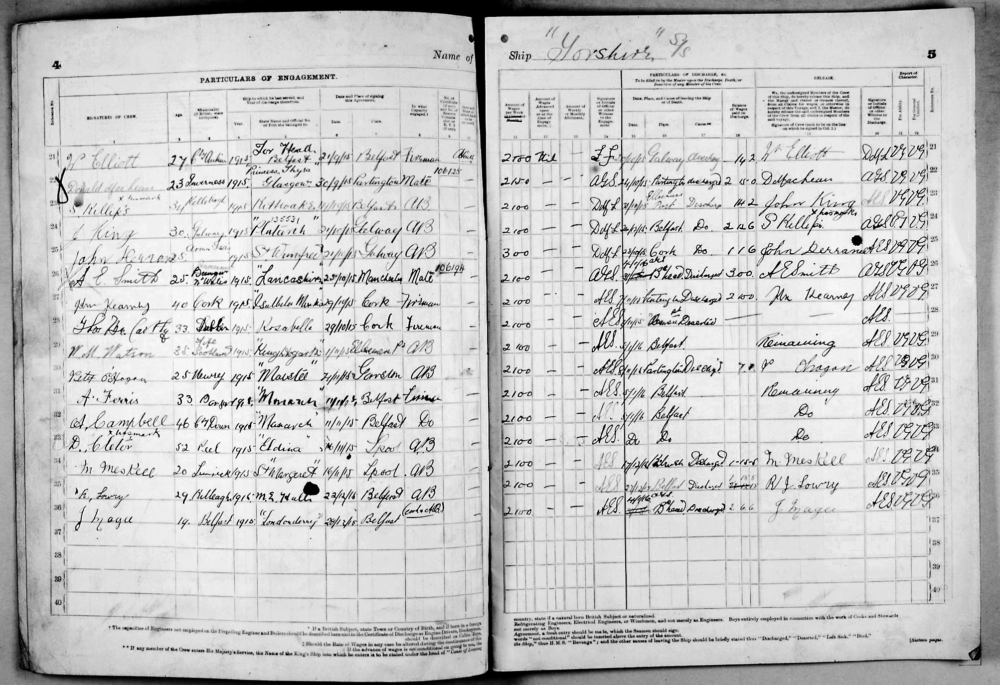 1915 crew list for the vessel 'YORKSHIRE'