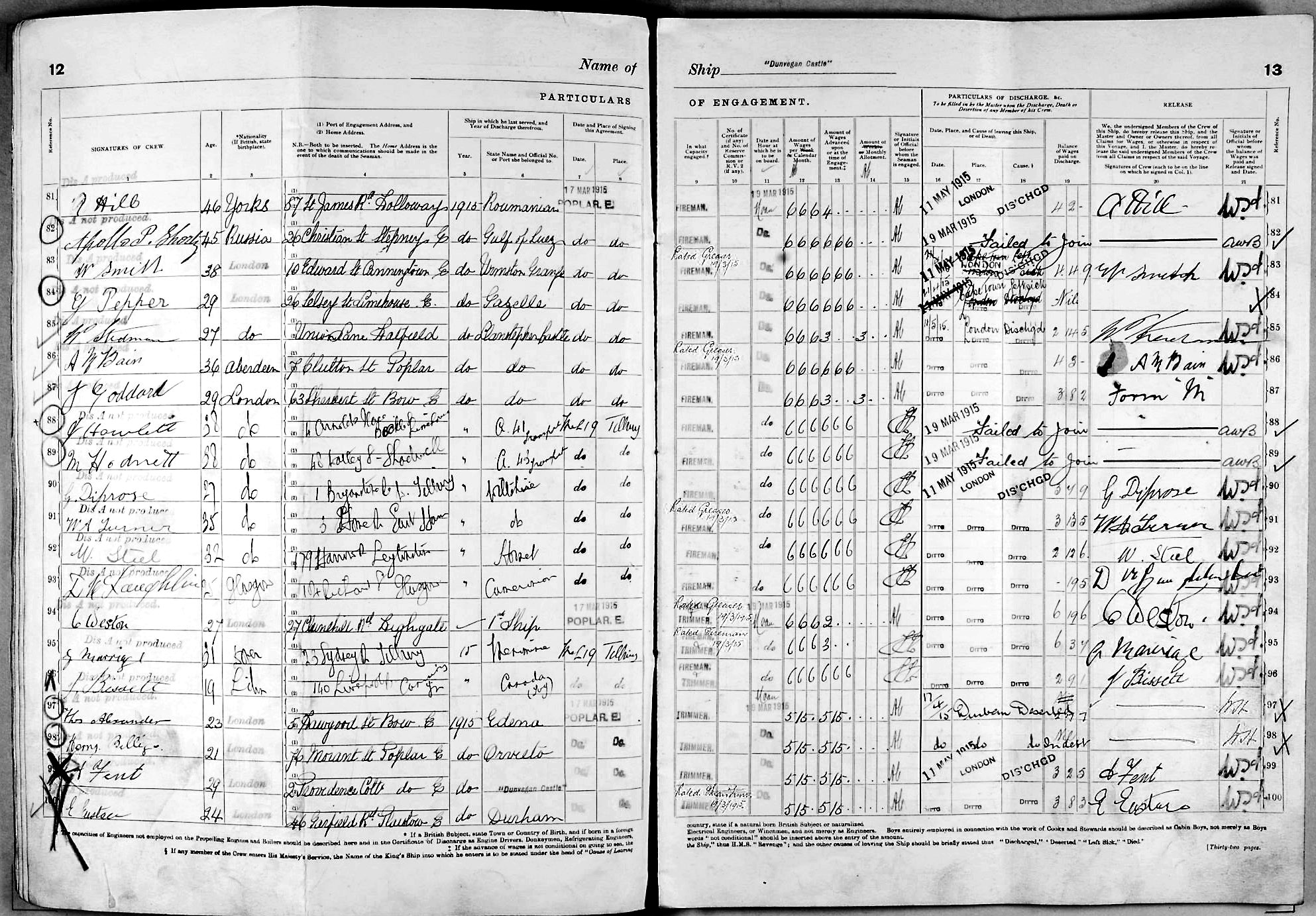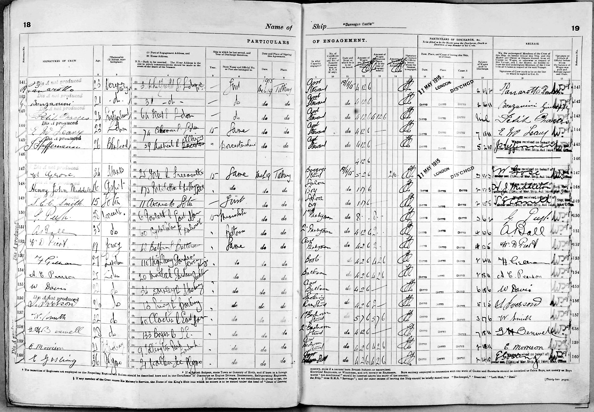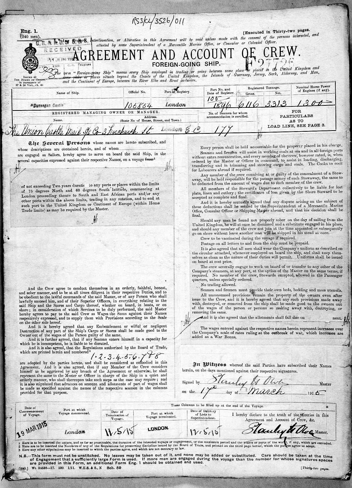 1915 crew list for the vessel 'DUNVEGAN CASTLE'