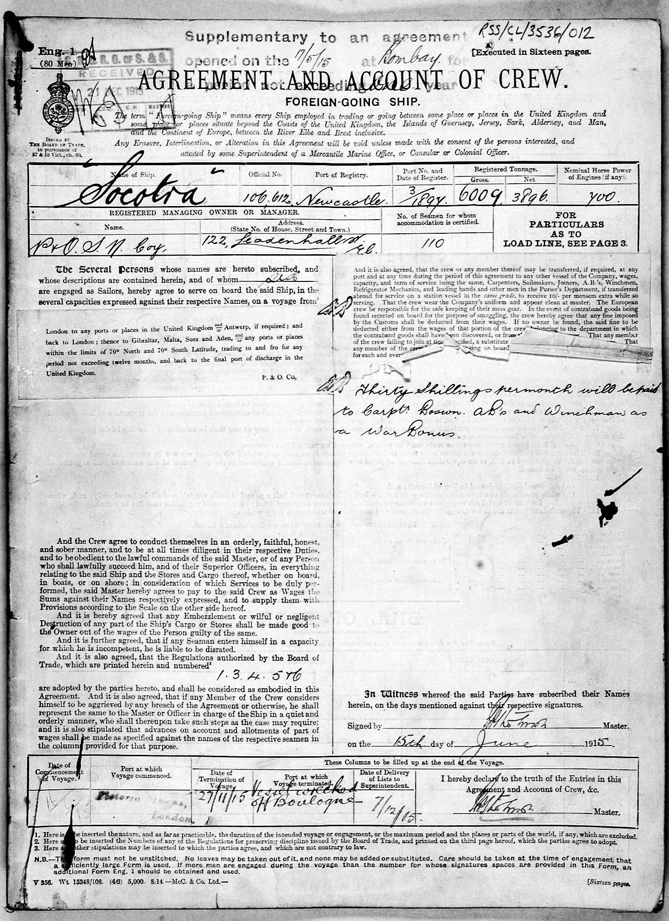 1915 crew list for the vessel 'SOCOTRA'