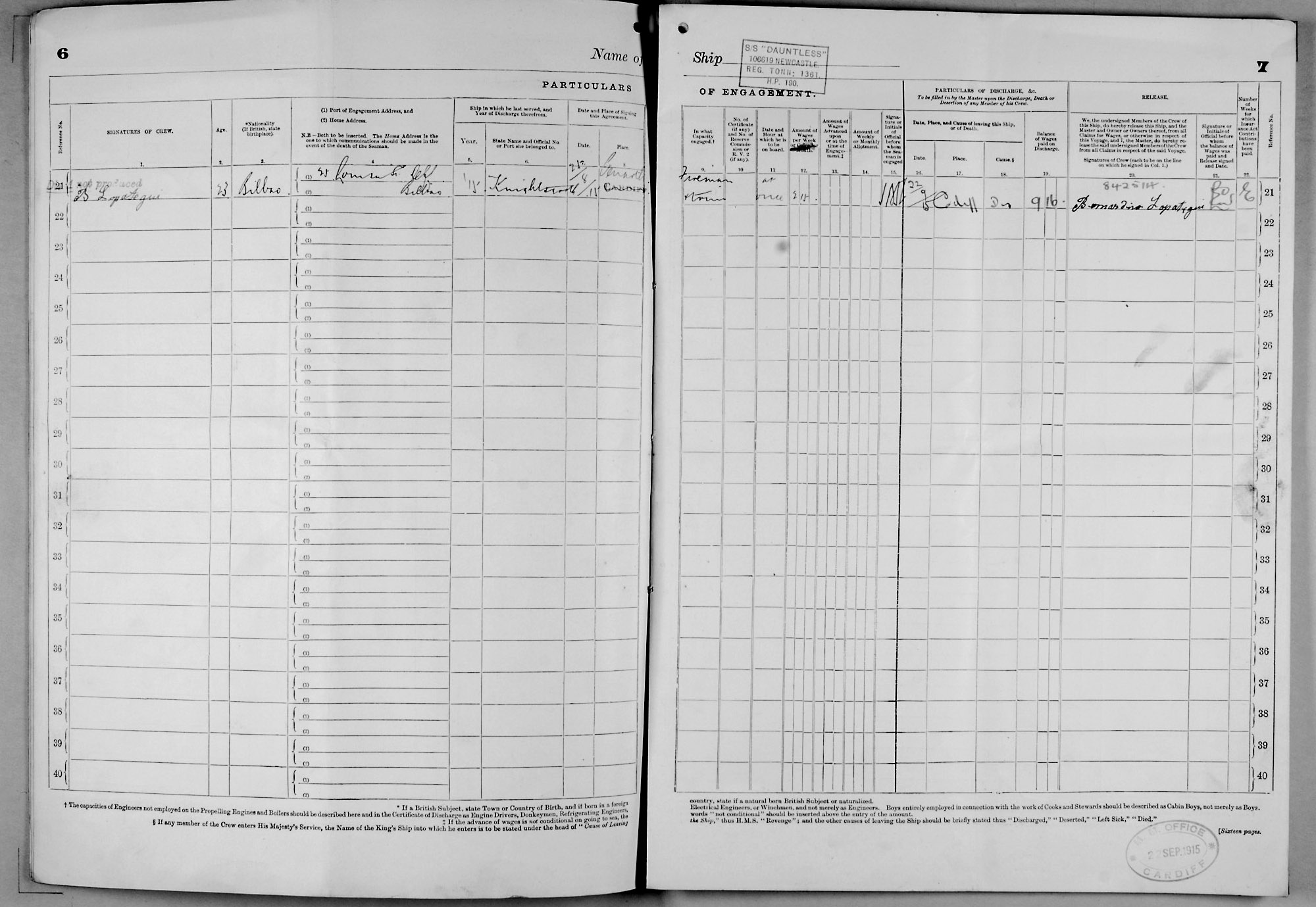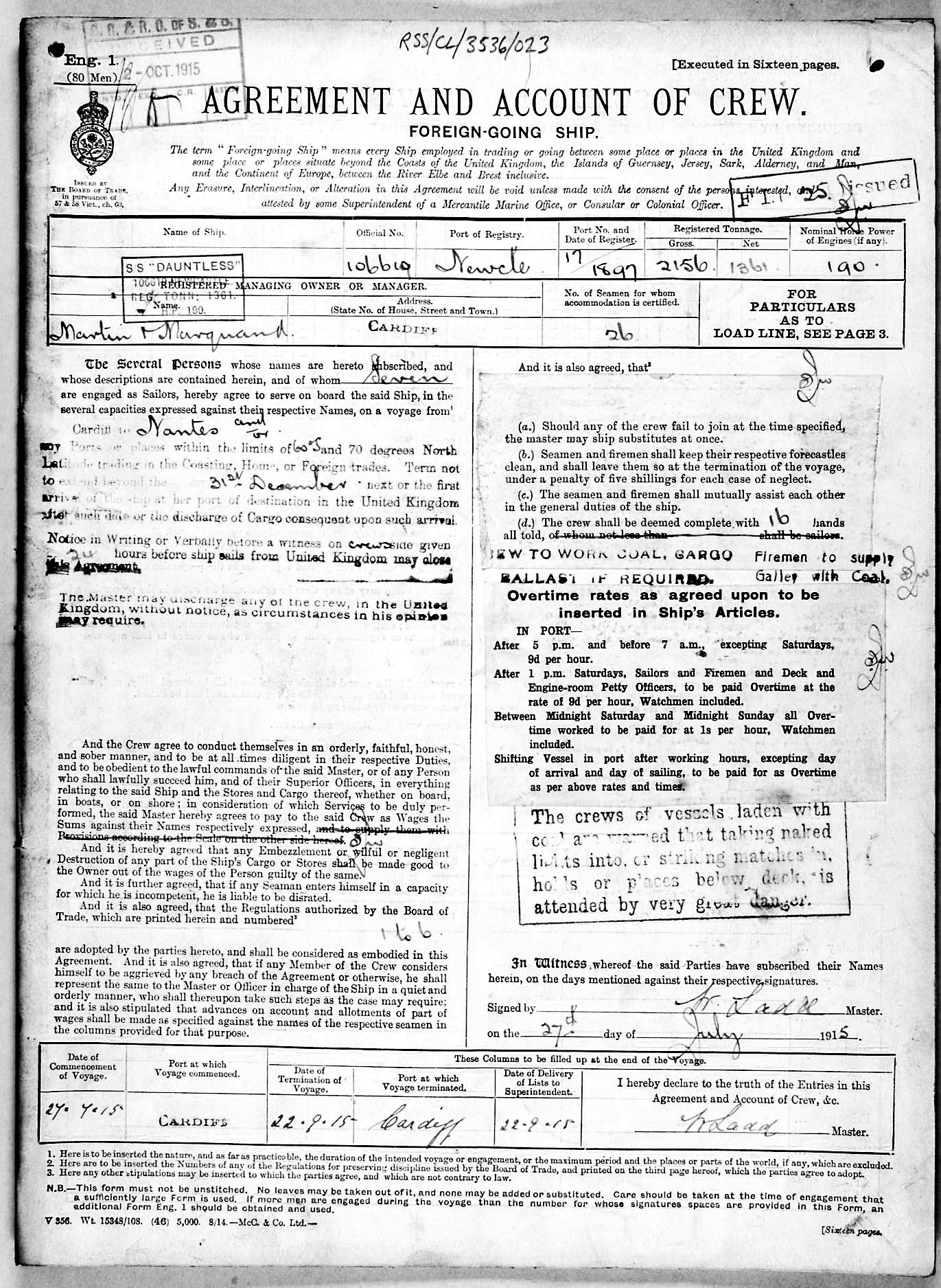 Crew list document for vessel 'DAUNTLESS'