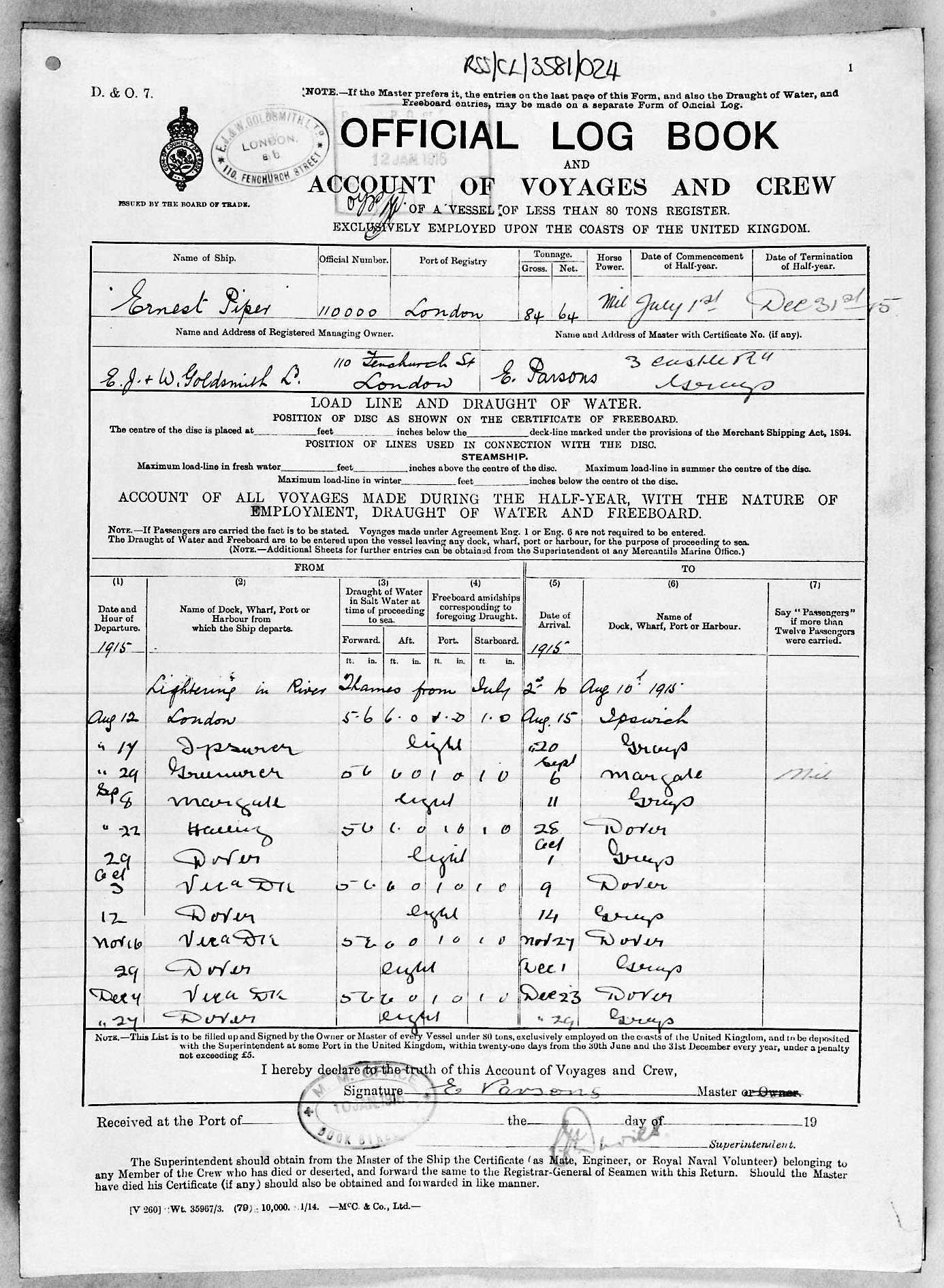 1915 crew list for the vessel 'ERNEST PIPER'