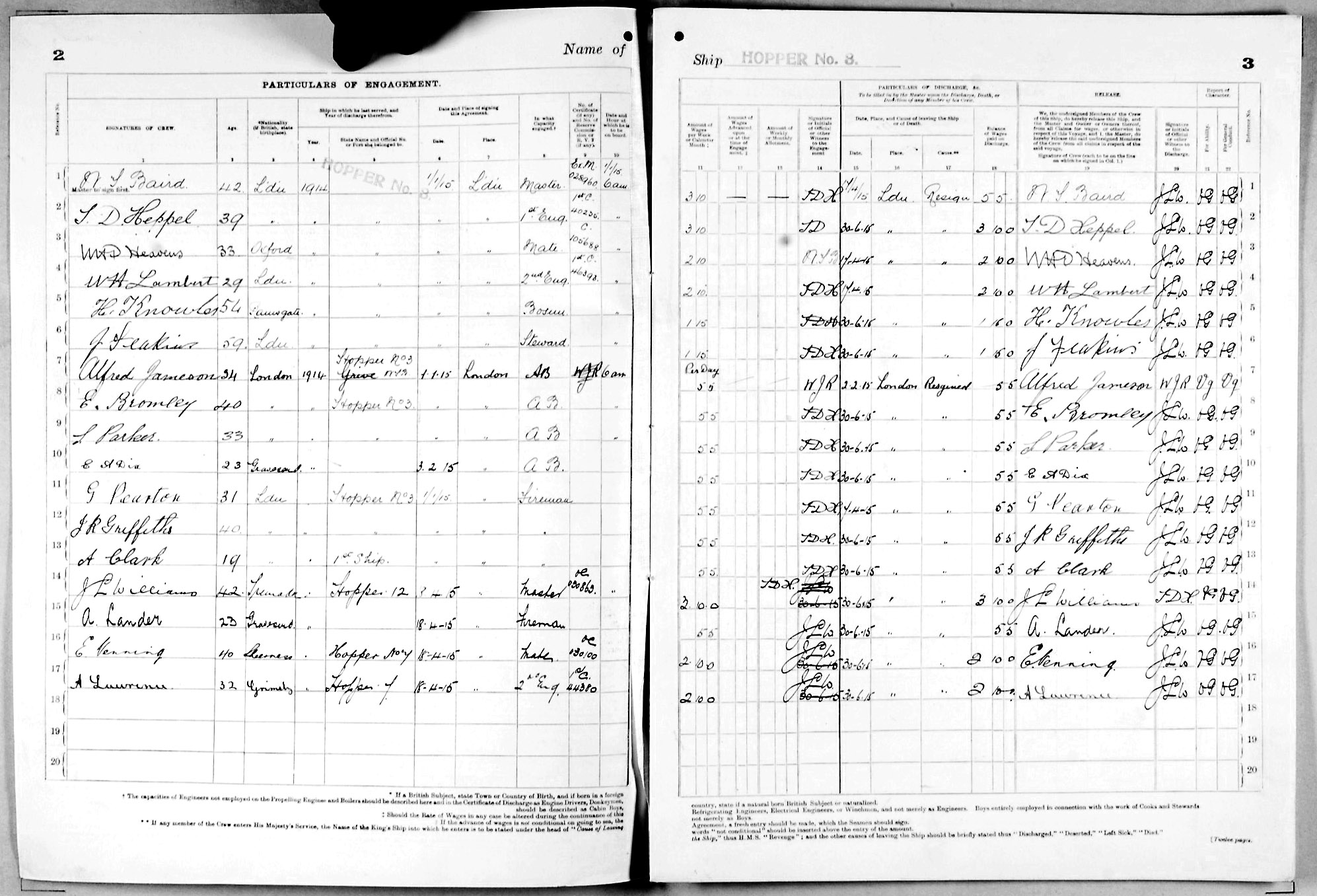 1915 crew list for the vessel 'THAMES CONSERVANCY HOPPER NO 3'