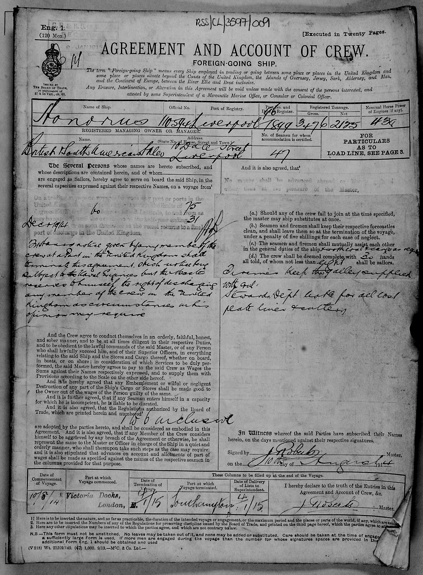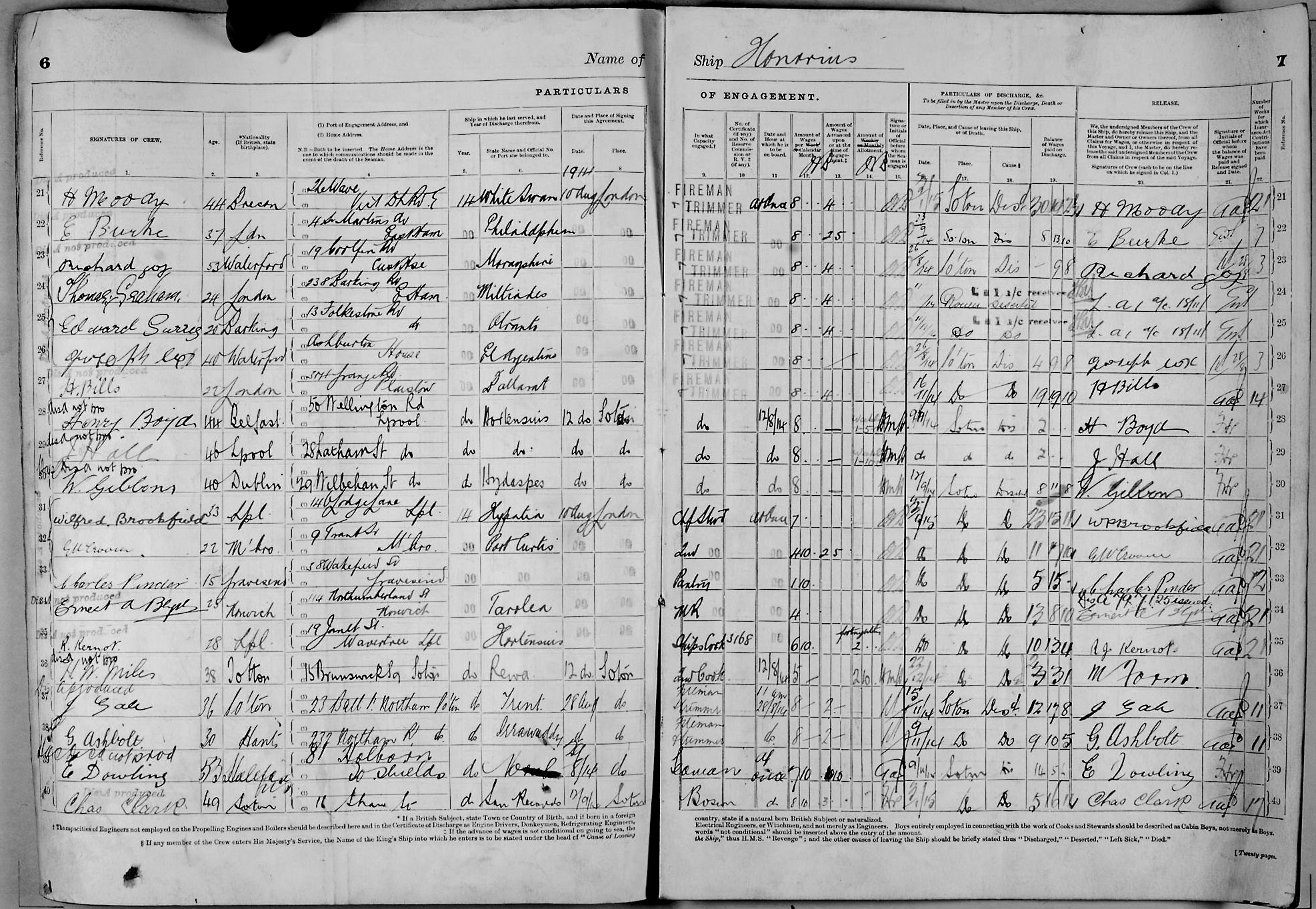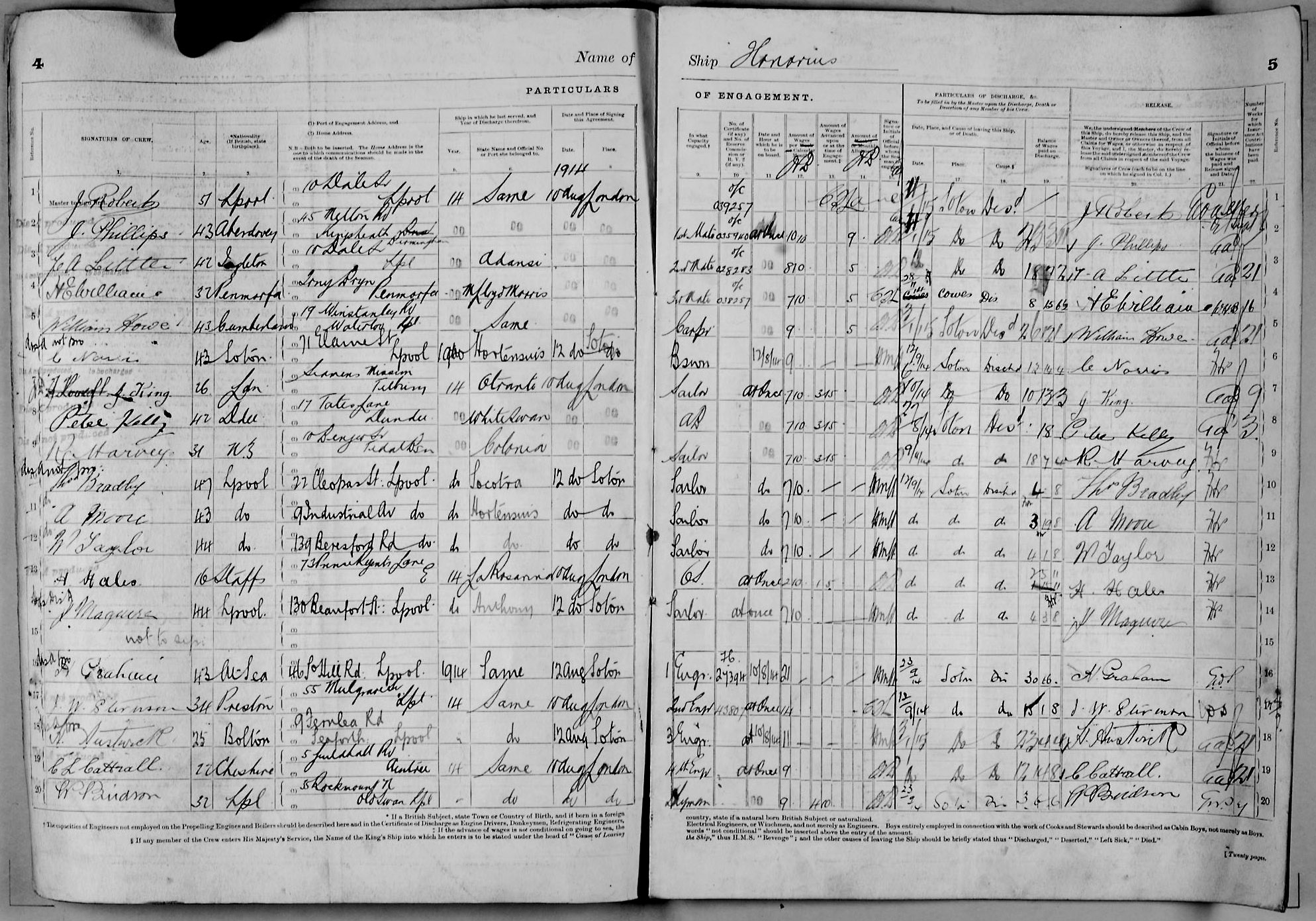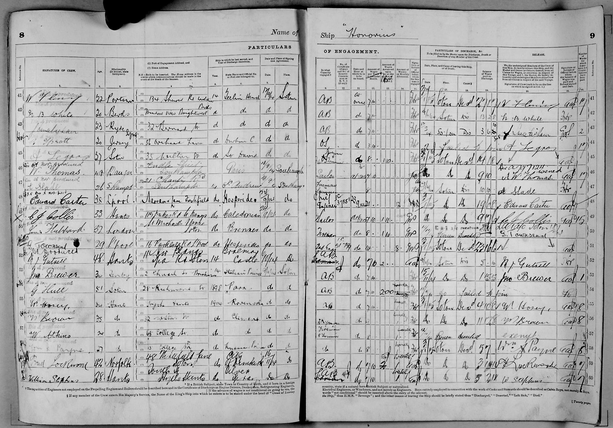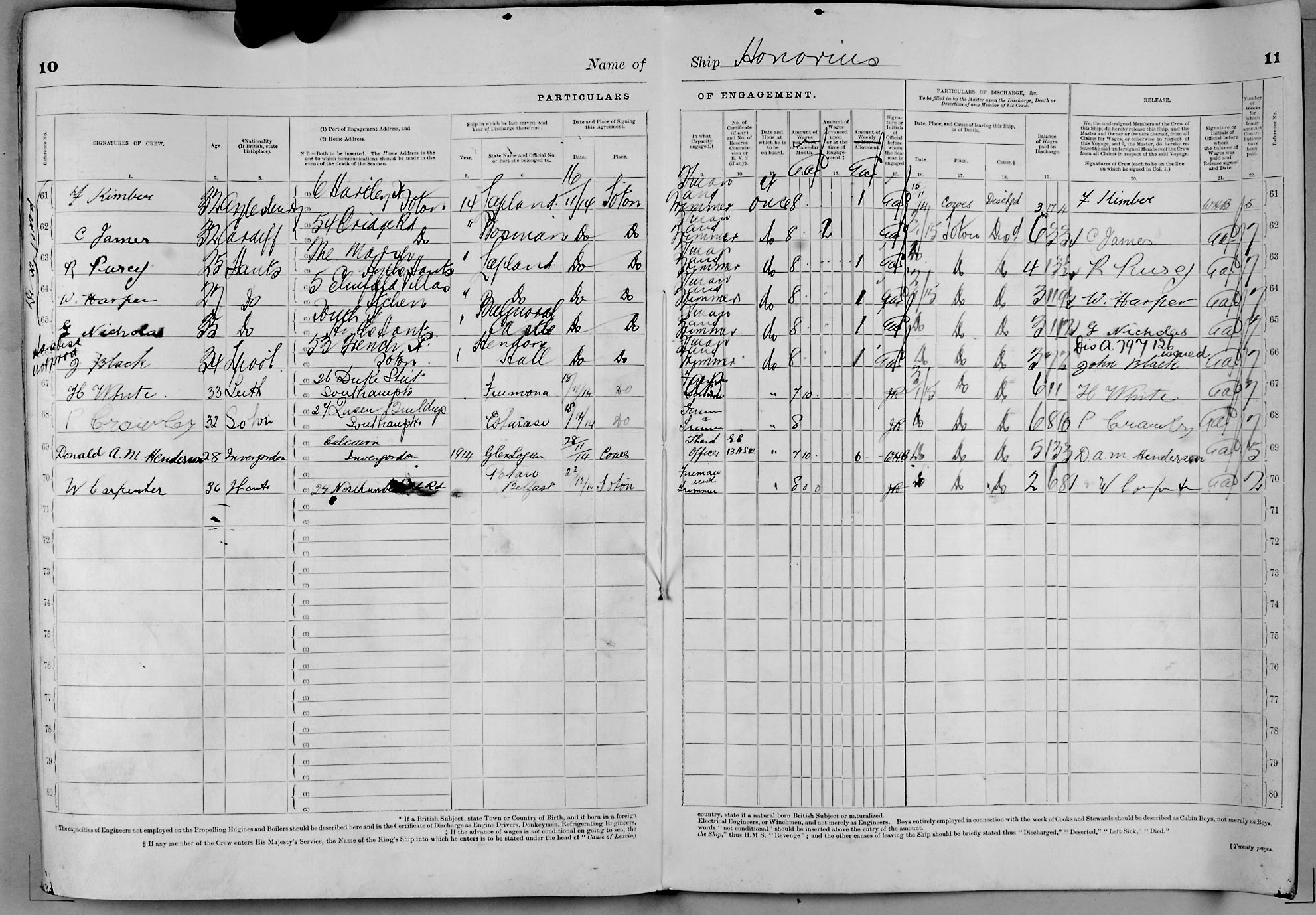 1915 crew list for the vessel 'HONORIUS'