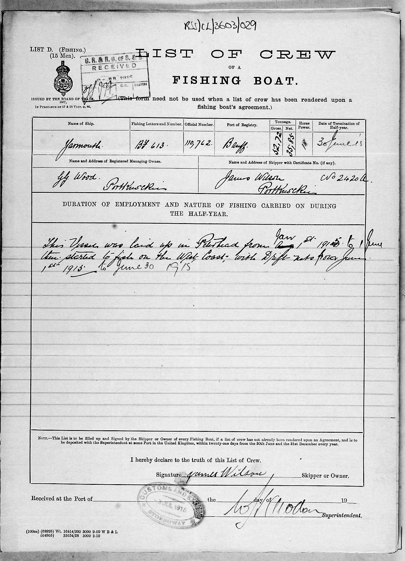1915 crew list for the vessel 'YARMOUTH'
