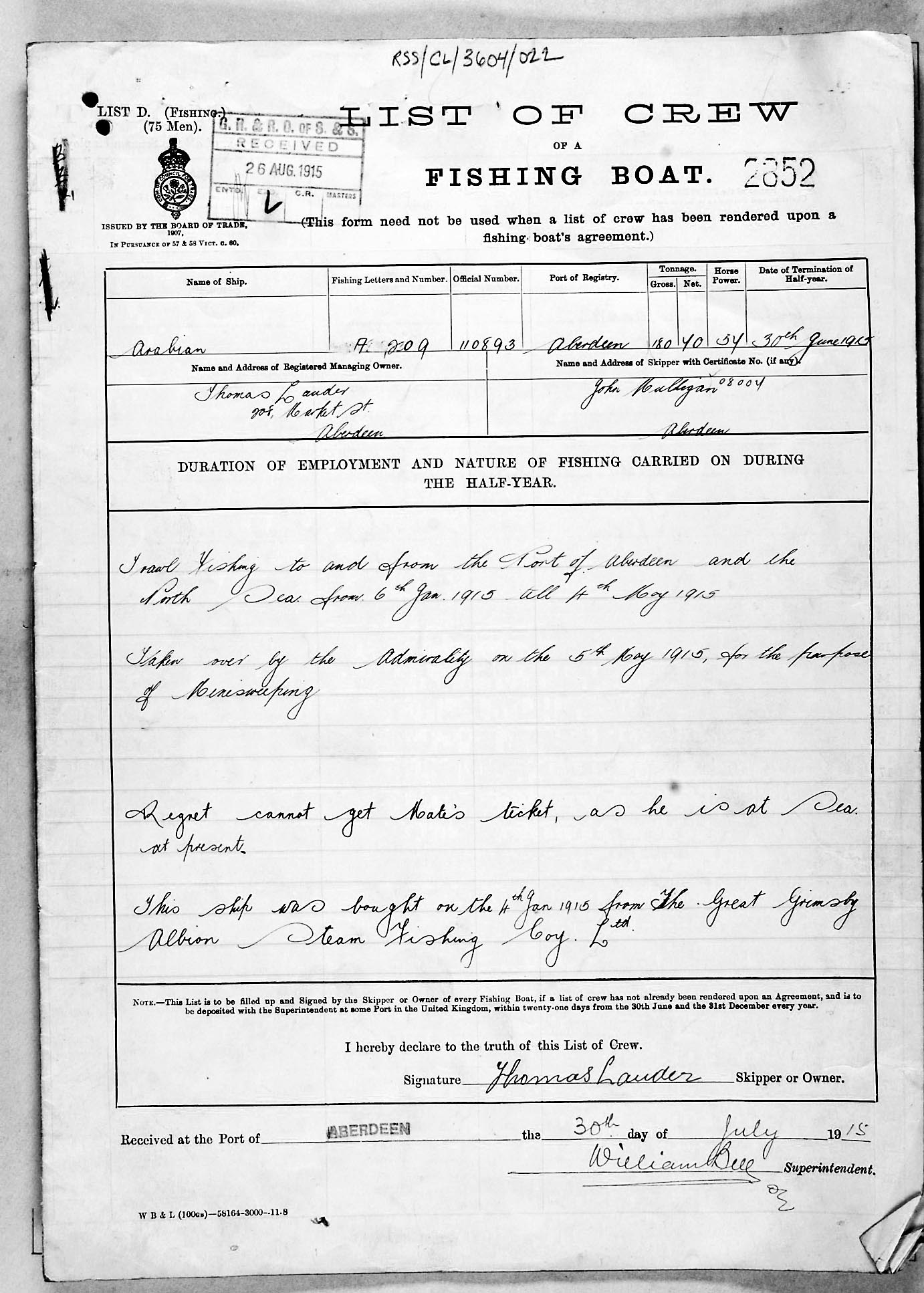 1915 crew list for the vessel 'ARABIAN'