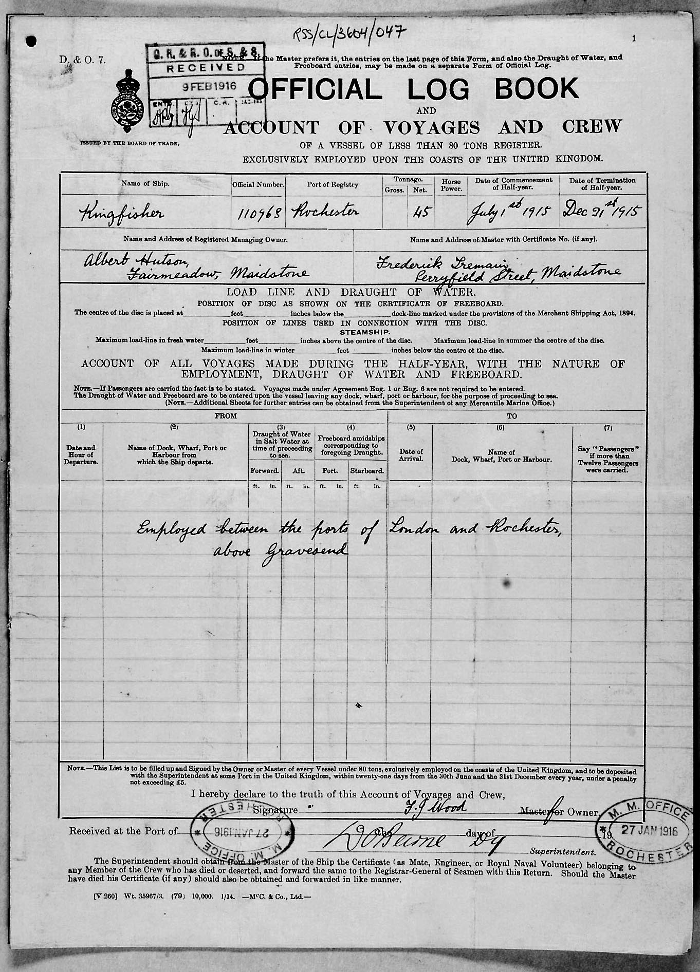 Crew list document for vessel 'KINGFISHER'
