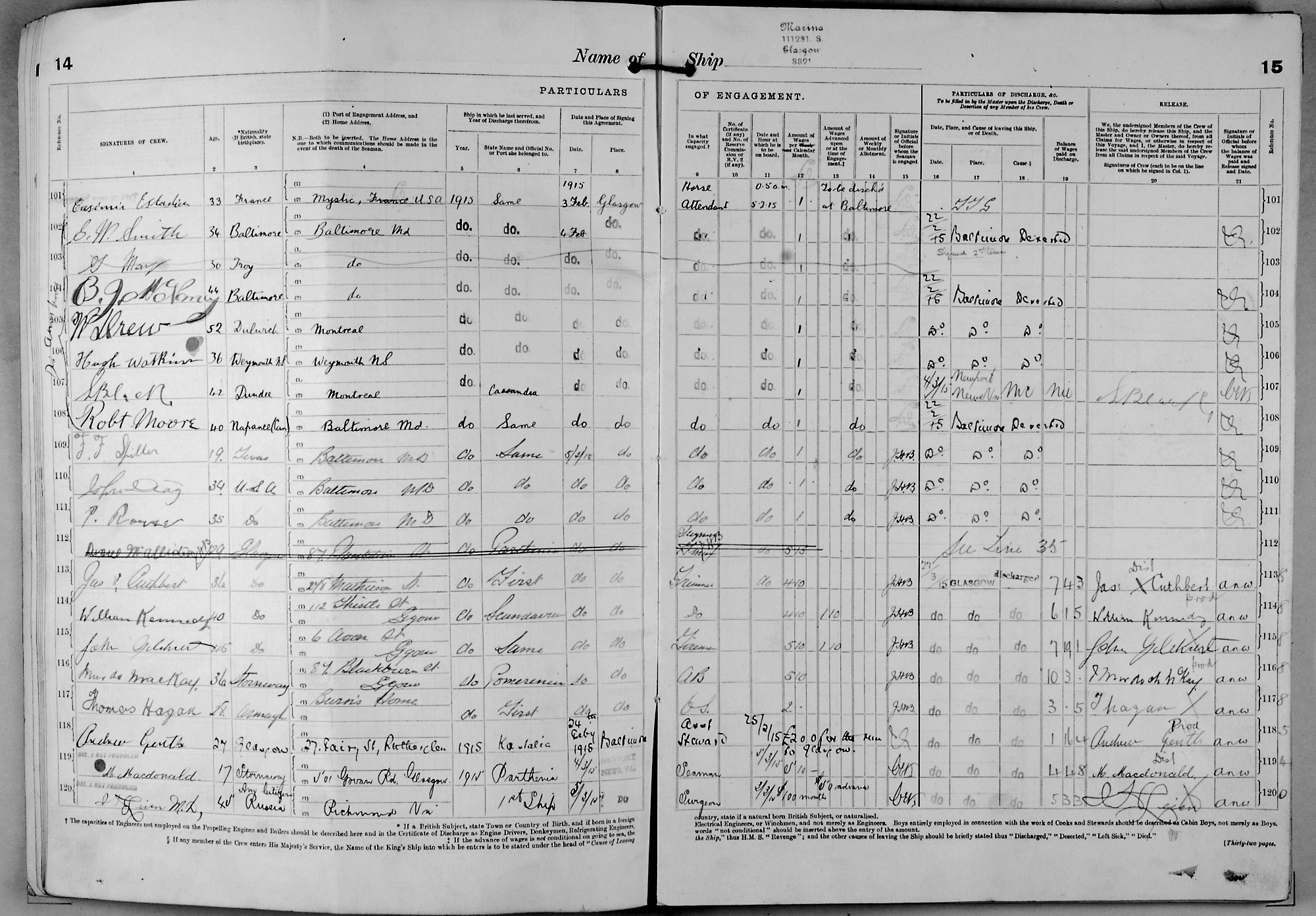 1915 crew list for the vessel 'MARINA'