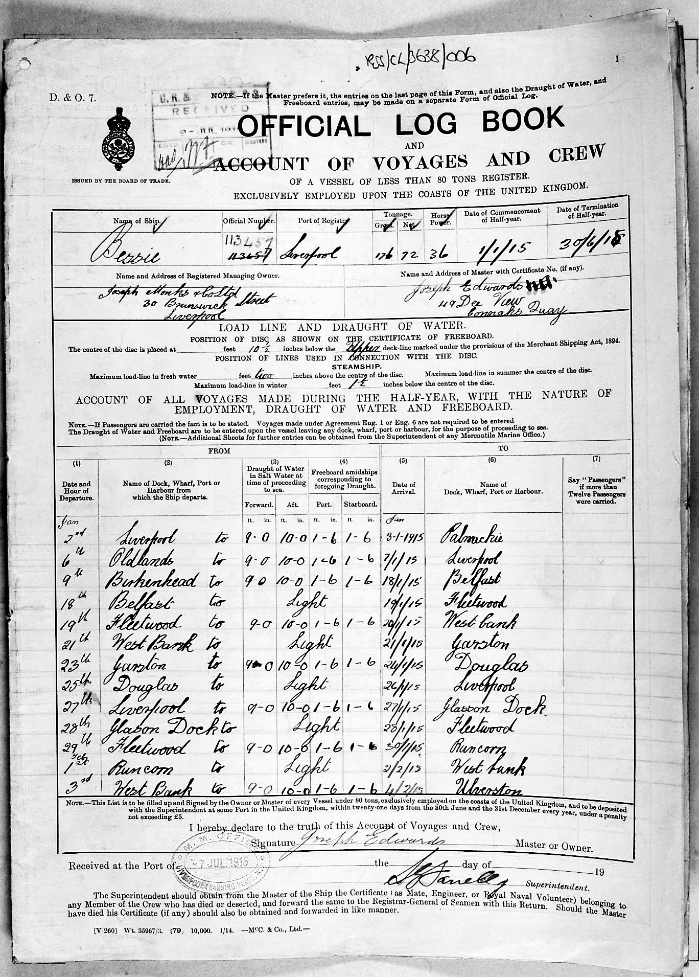 1915 crew list for the vessel 'BESSIE'