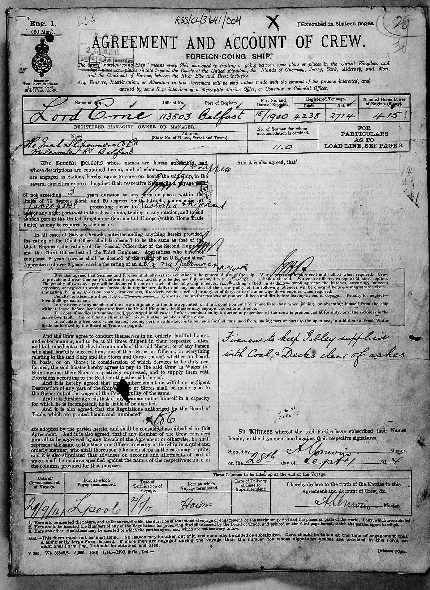 1915 crew list for the vessel 'LORD ERNE'